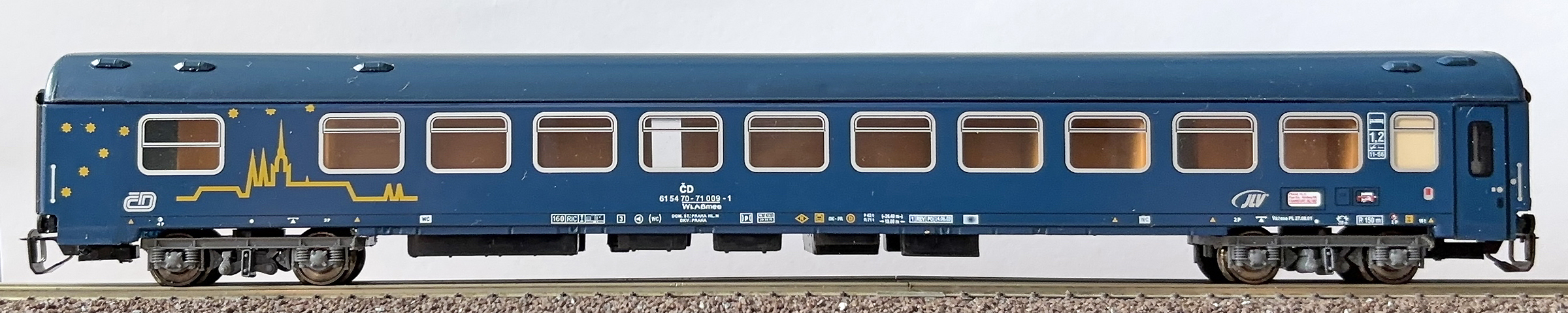 | lůžkový vůz tmavě modrý se siluetou Prahy |