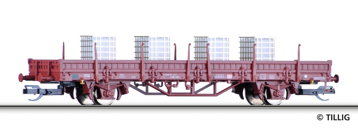 | nízkostěnný nákladní vůz červenohnědý s nákladem 4 IBCkontejnerů „Gefahrgut” |