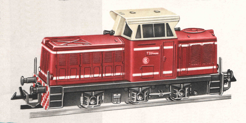 | dieselová lokomotiva červená s bílými proužky, krémová budka, černý rám a pojezd |