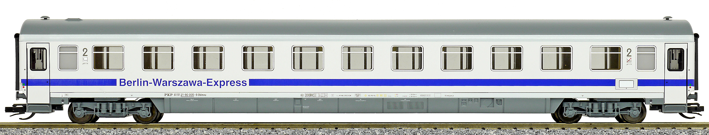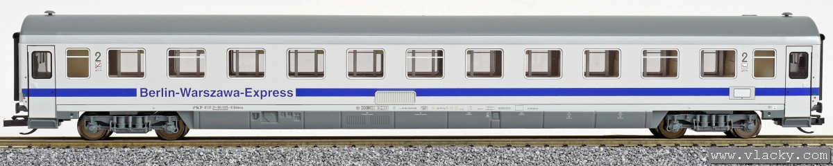 | rychlíkový vůz bílý s modrým pásem a šedou střechou 2. tř. „Berlin-Warszawa-Express“ |
