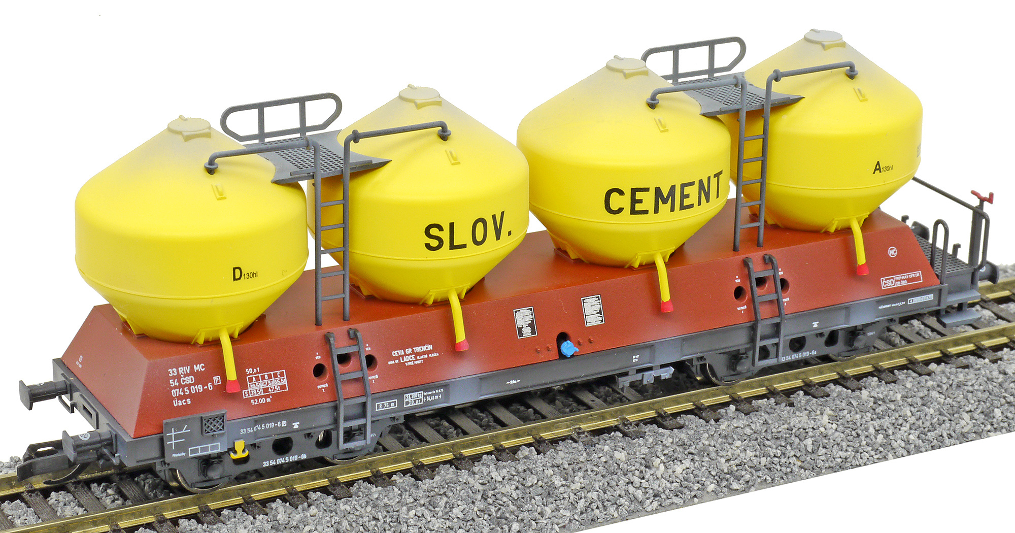 | nákladní samovýsypný vůz červenohnědý se žlutými nádobami „SLOV. CEMENT“ |