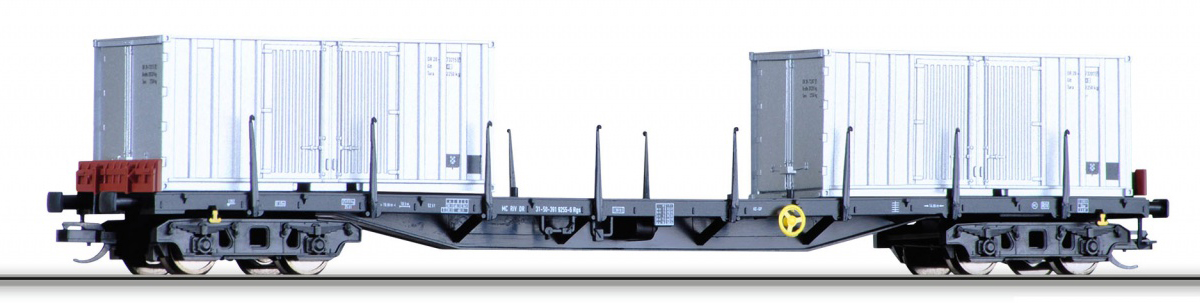| nákladní plošinový vůz černý s nákladem dvou kontejnerů 20' |