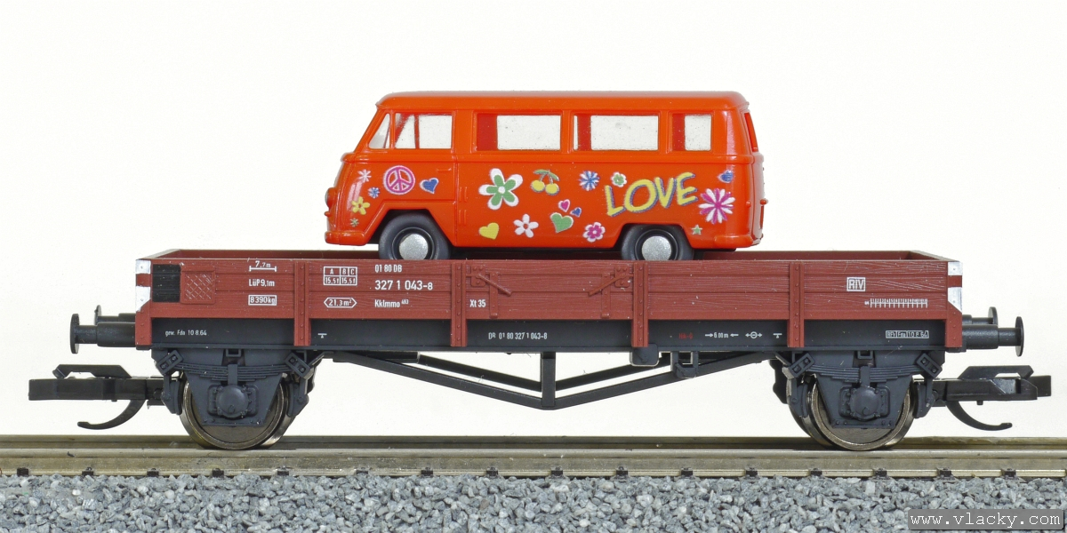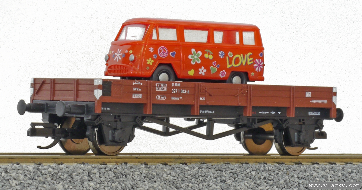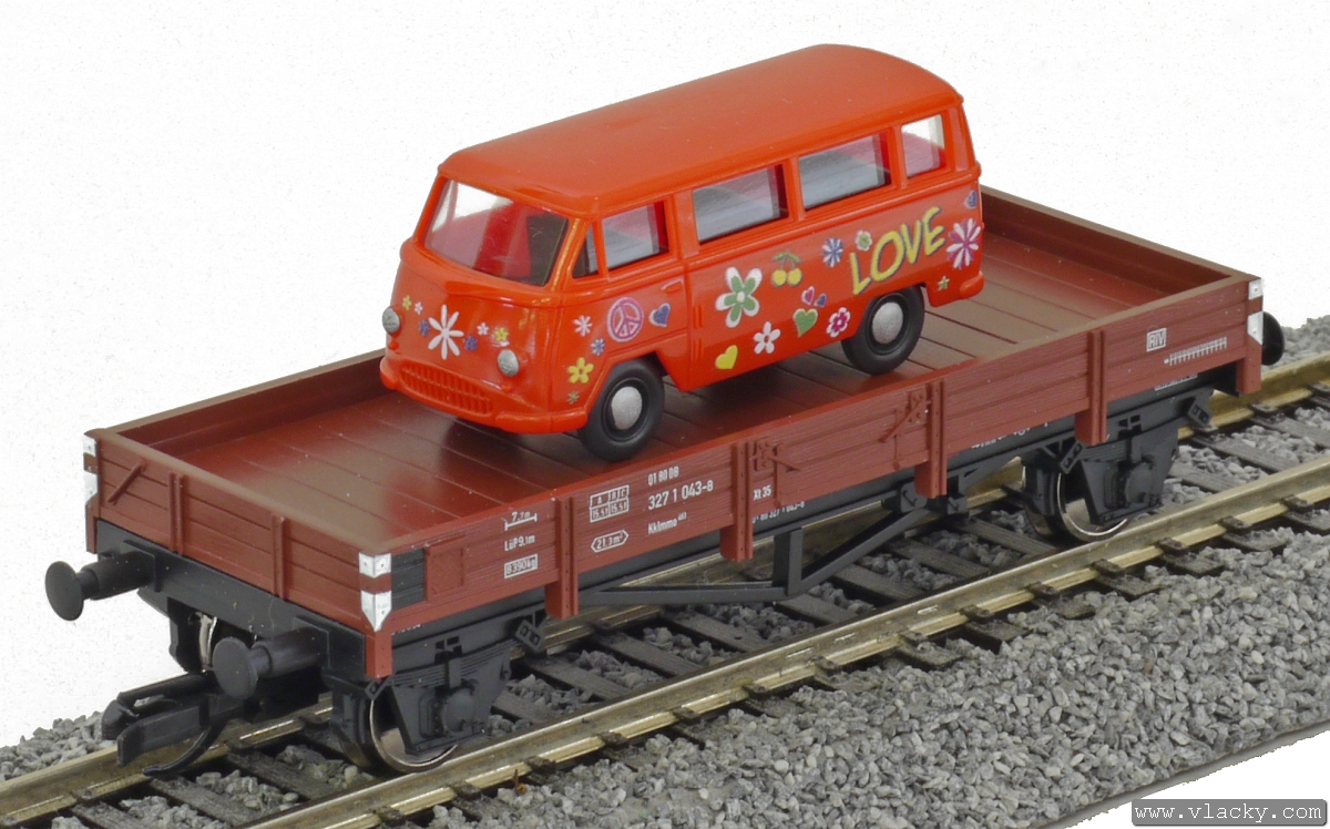 | nízkostěnný nákladní vůz červenohnědý s nákladem Matador busu „Flower Power“ |