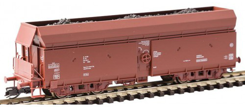| samovýsypný vůz červenohnědý s nákladem uhlí |