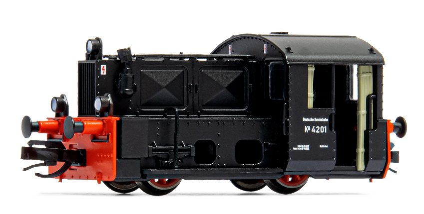 | dieselová lokomotiva černá s červenými čely, otevřená budka strojvedoucího |