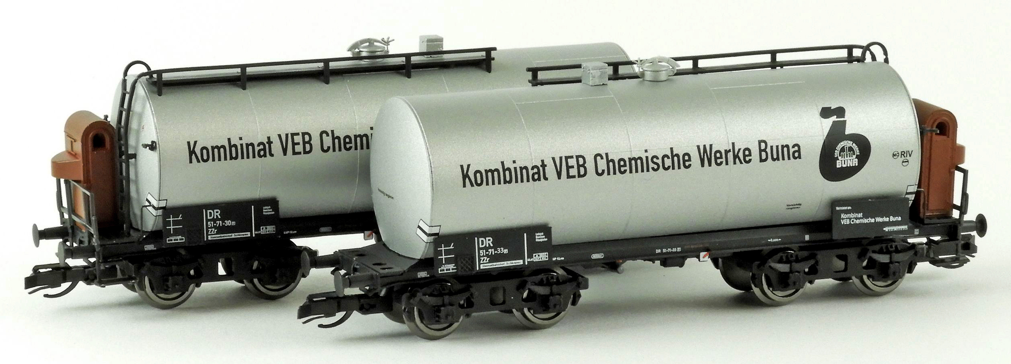 | set dvou kotlových vozů s logem „BUNA“ a s brzdařskou budkou |