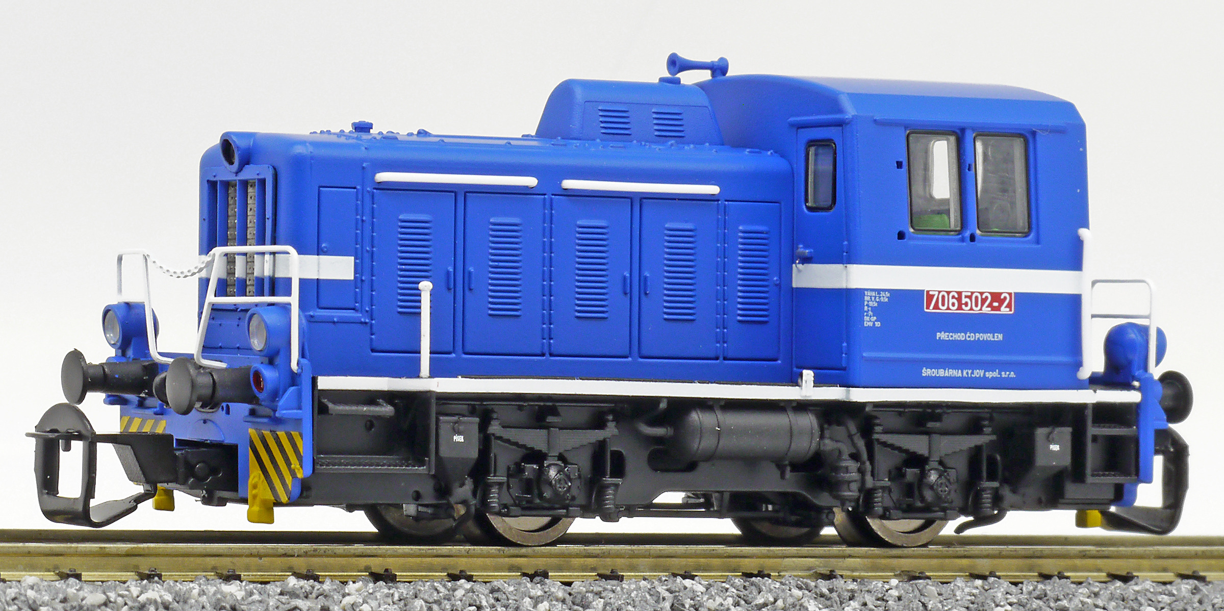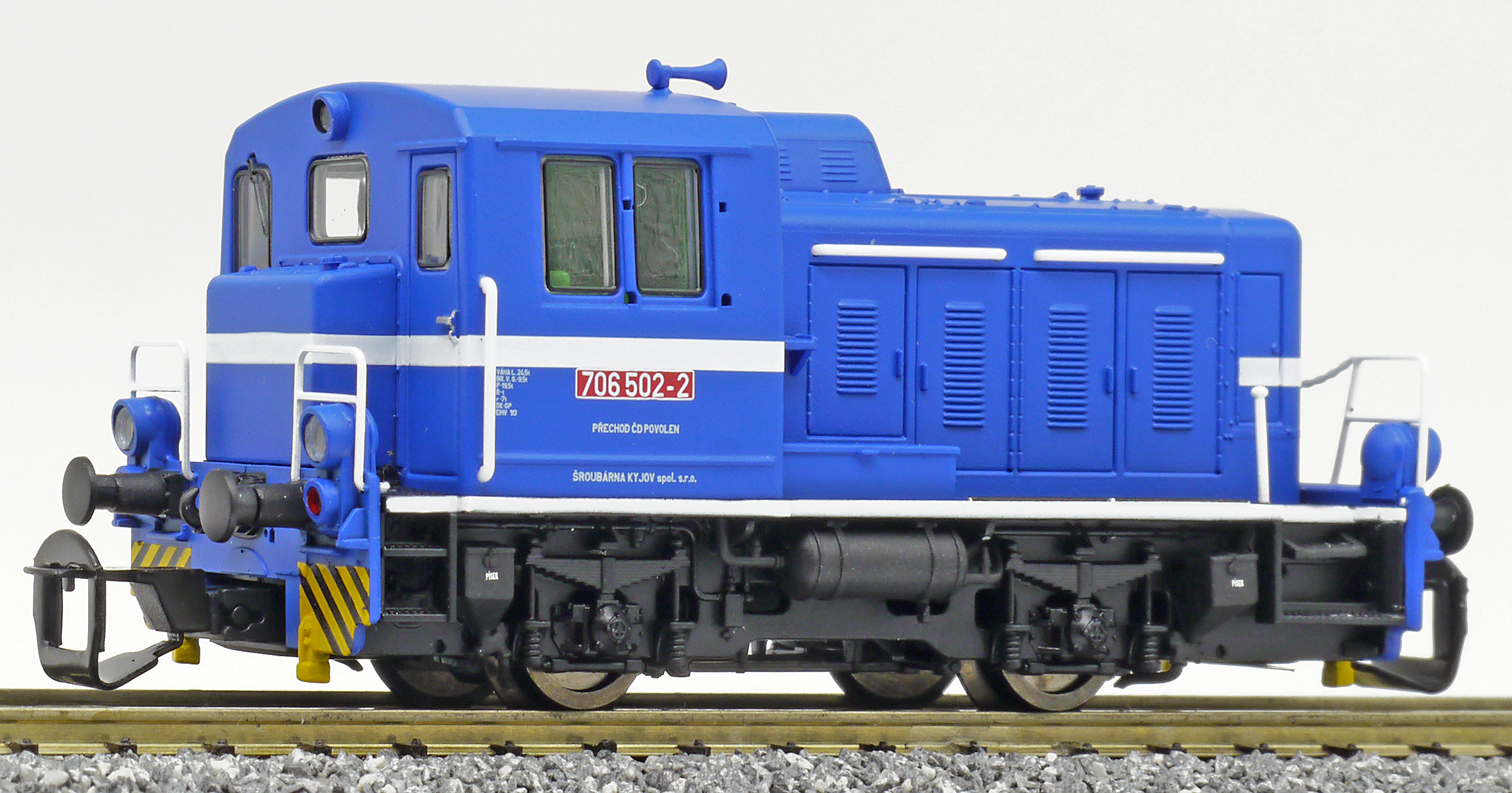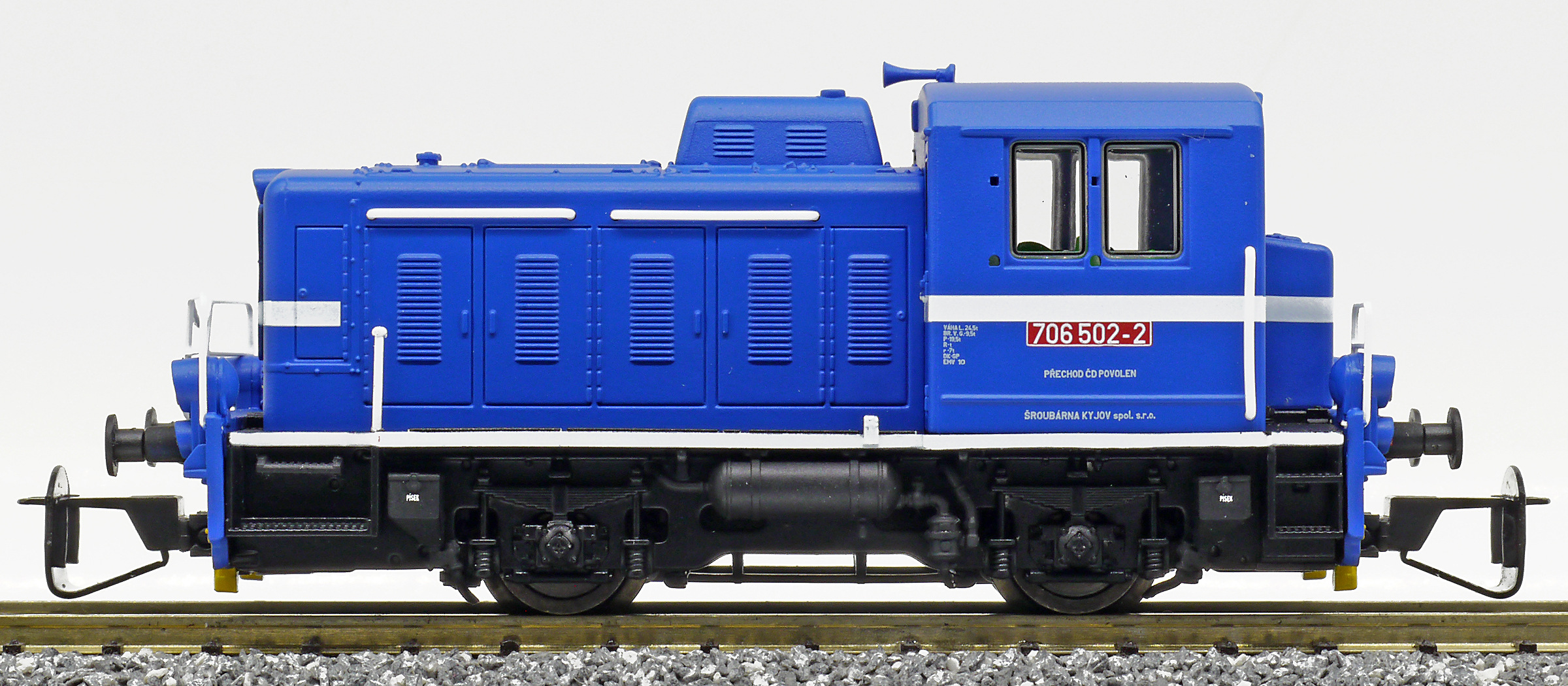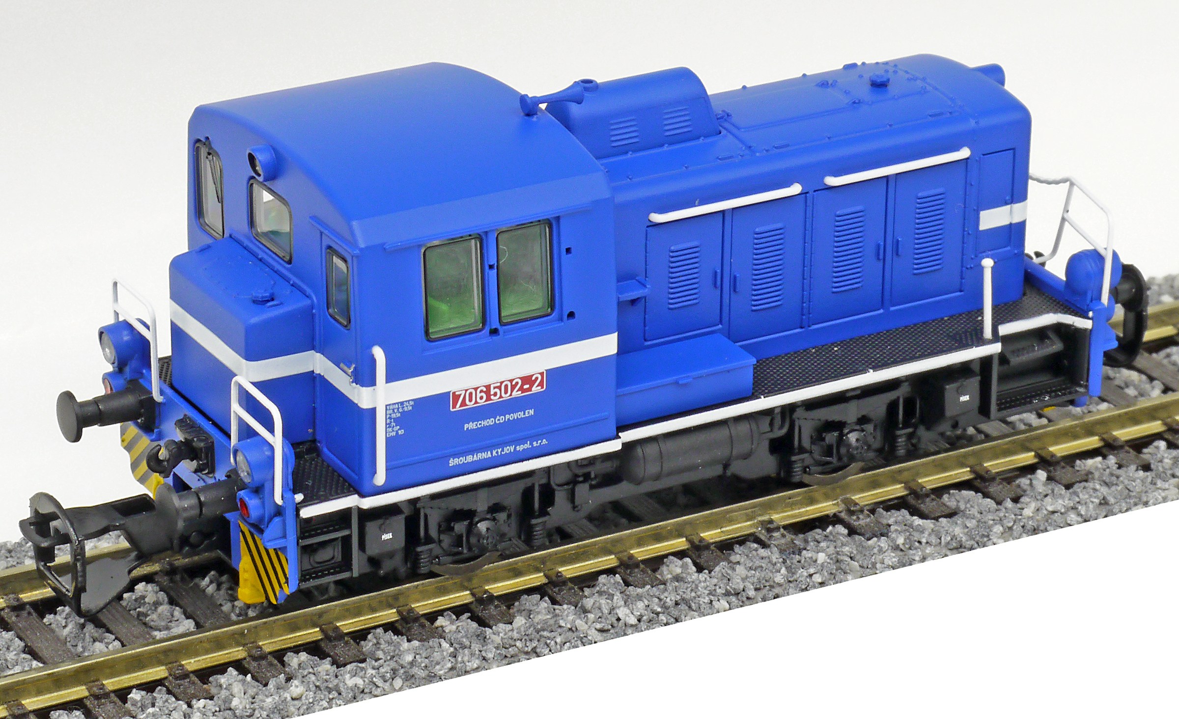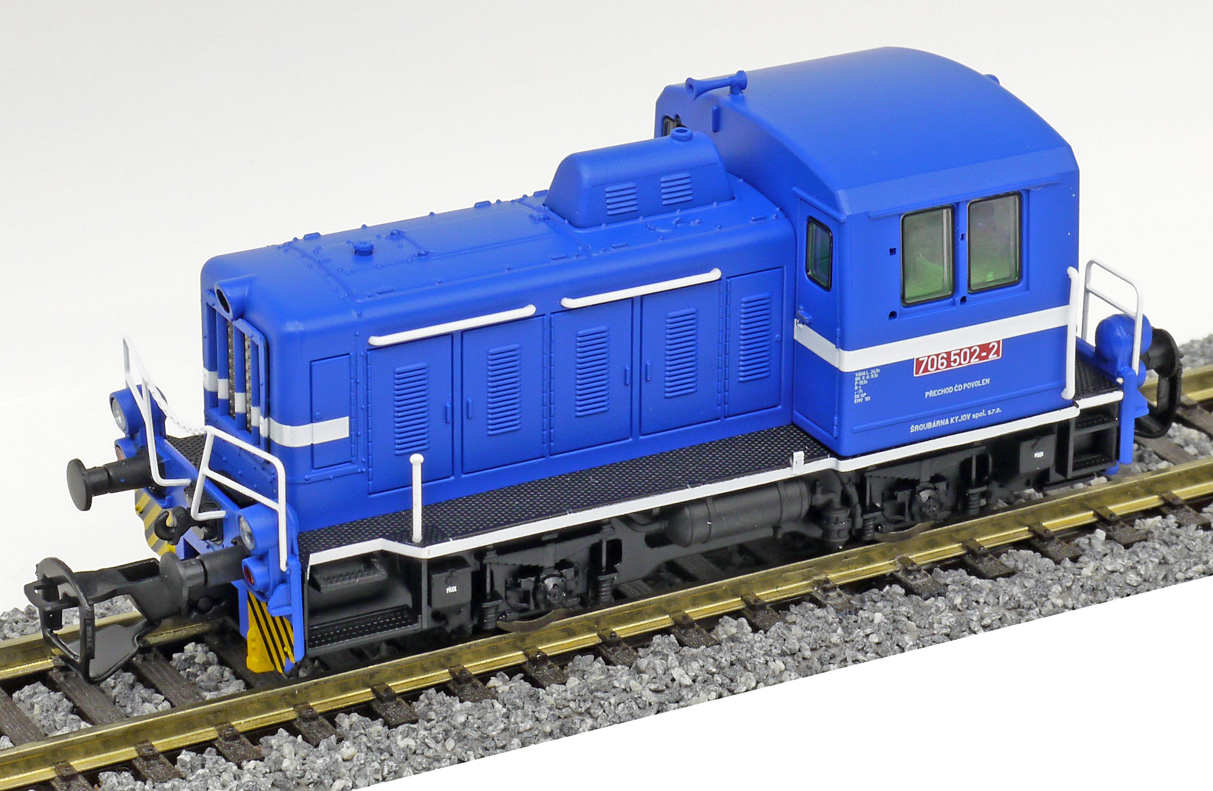 | dieselová lokomotiva modrá s černý pojezdem a bílým lemováním |