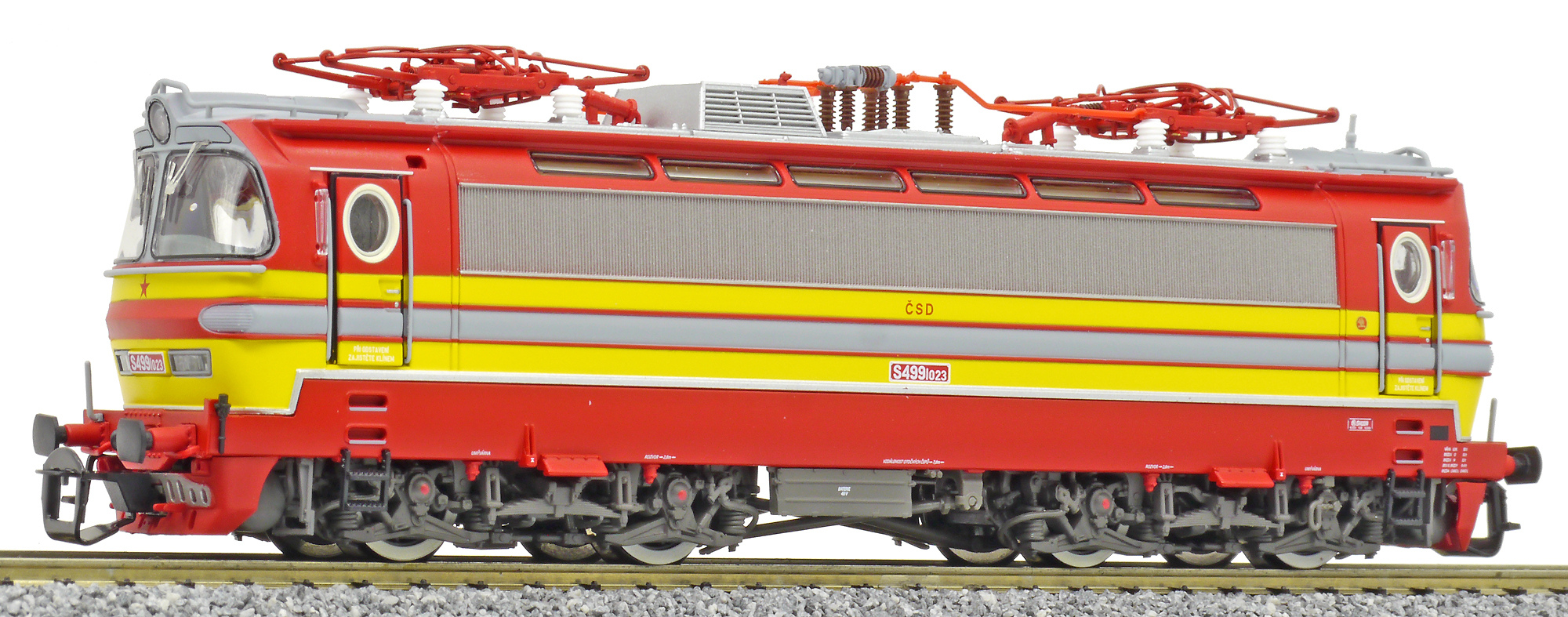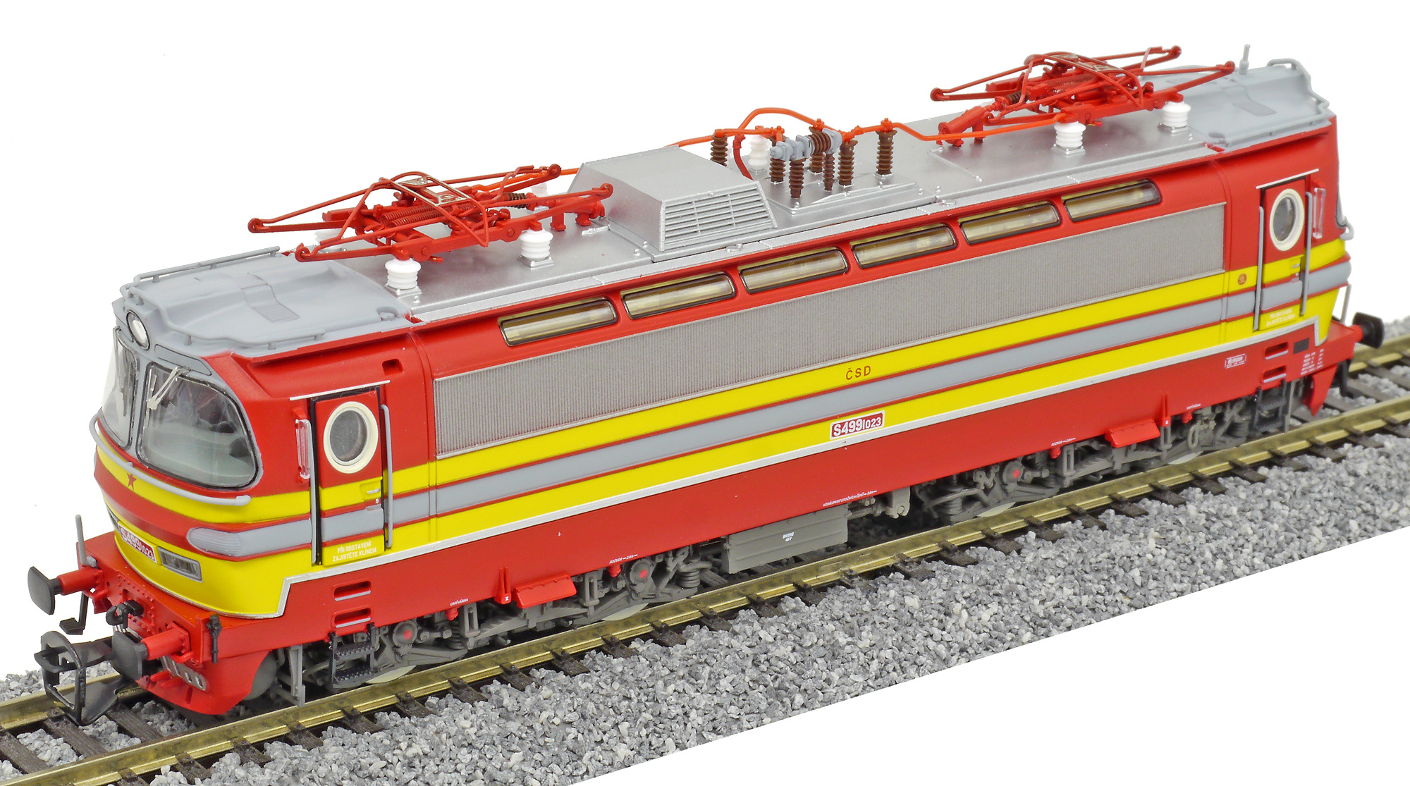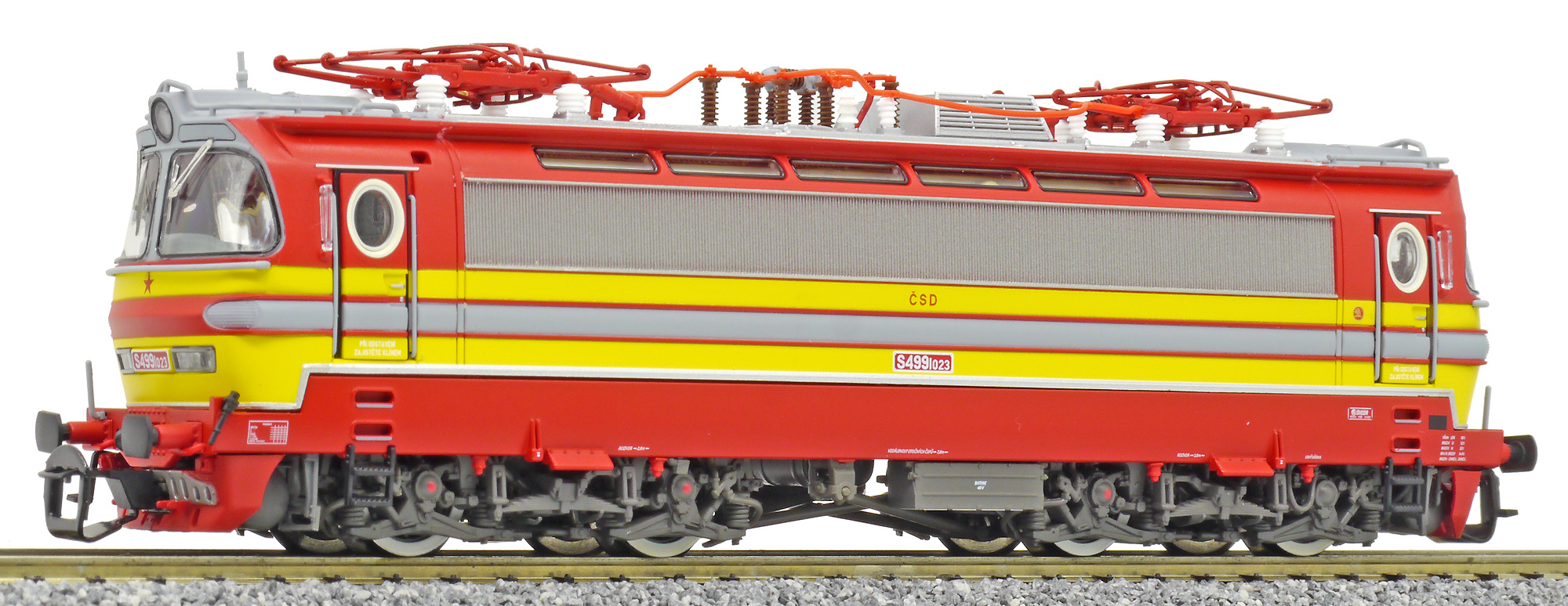 | elektrická lokomotiva v barevné kombinaci červená-žlutá, šedá střecha |