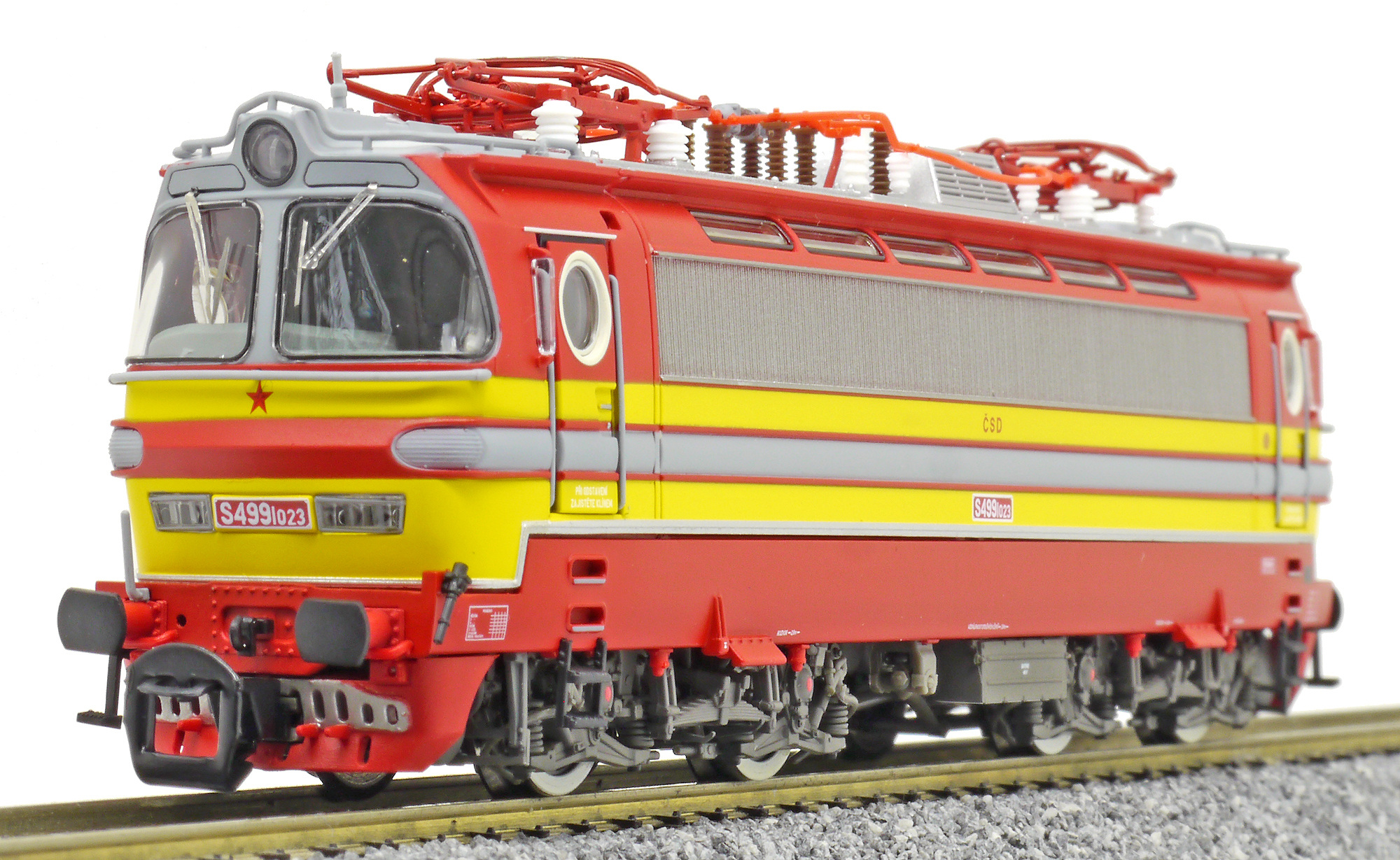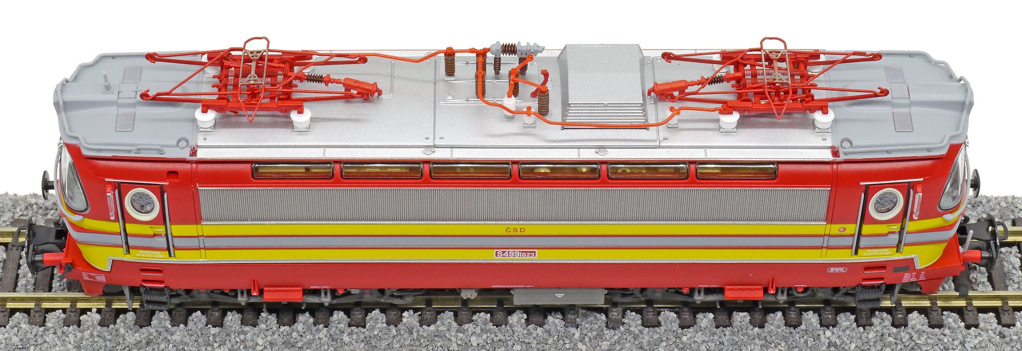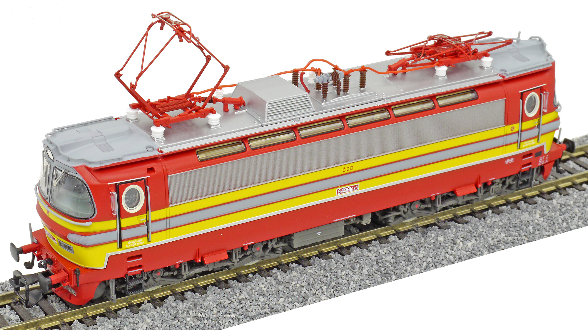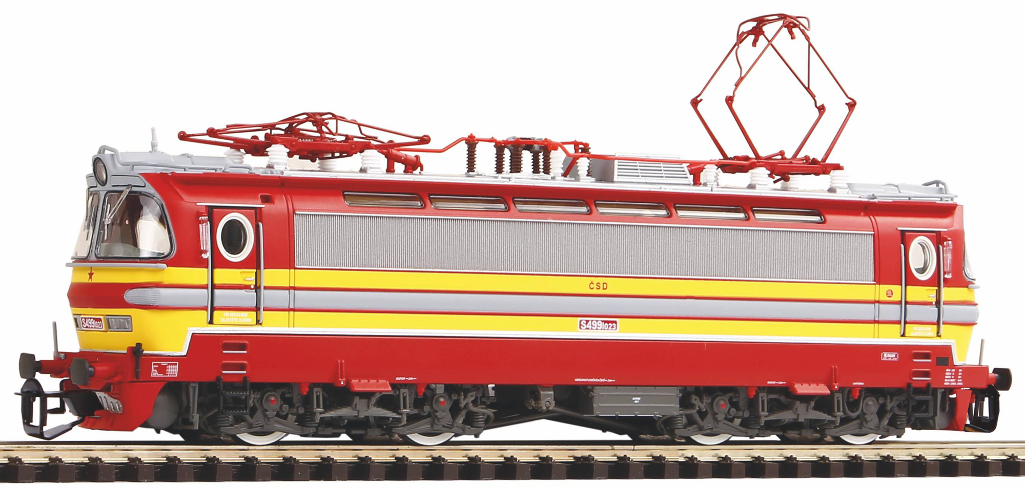 | elektrická lokomotiva v barevné kombinaci červená-žlutá, šedá střecha |