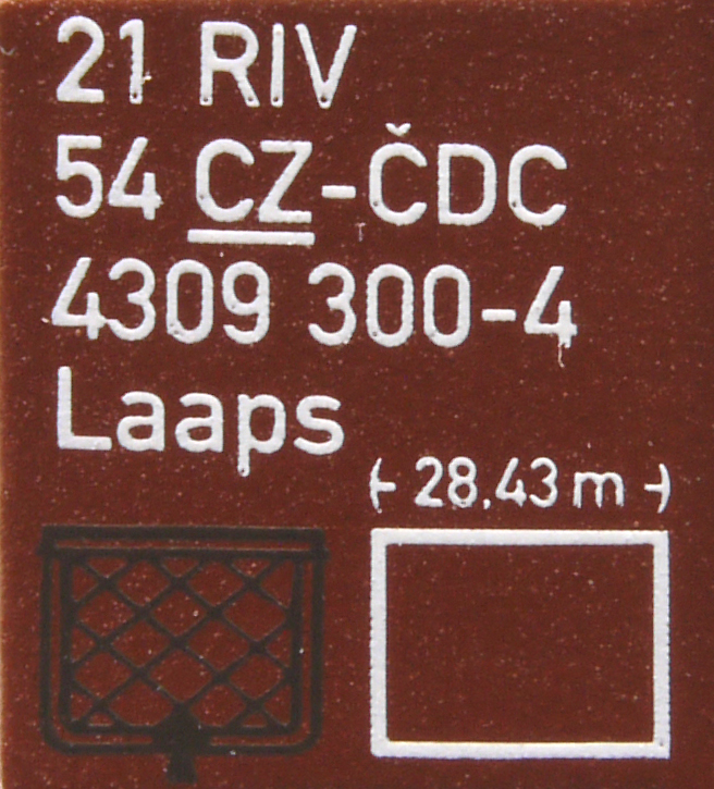 | • 21 54 4309 300-4 | → | nákladní, nezávislé nápravy, pevný rozchod, ve vlastnictví železniční správy, RIV, PPV |