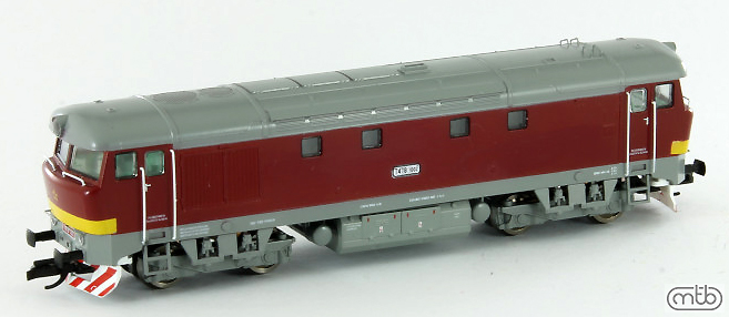 Popis   dieselová lokomotiva červená s šedou střechou, rámem a pojezdem, výstražný žlutý pruh