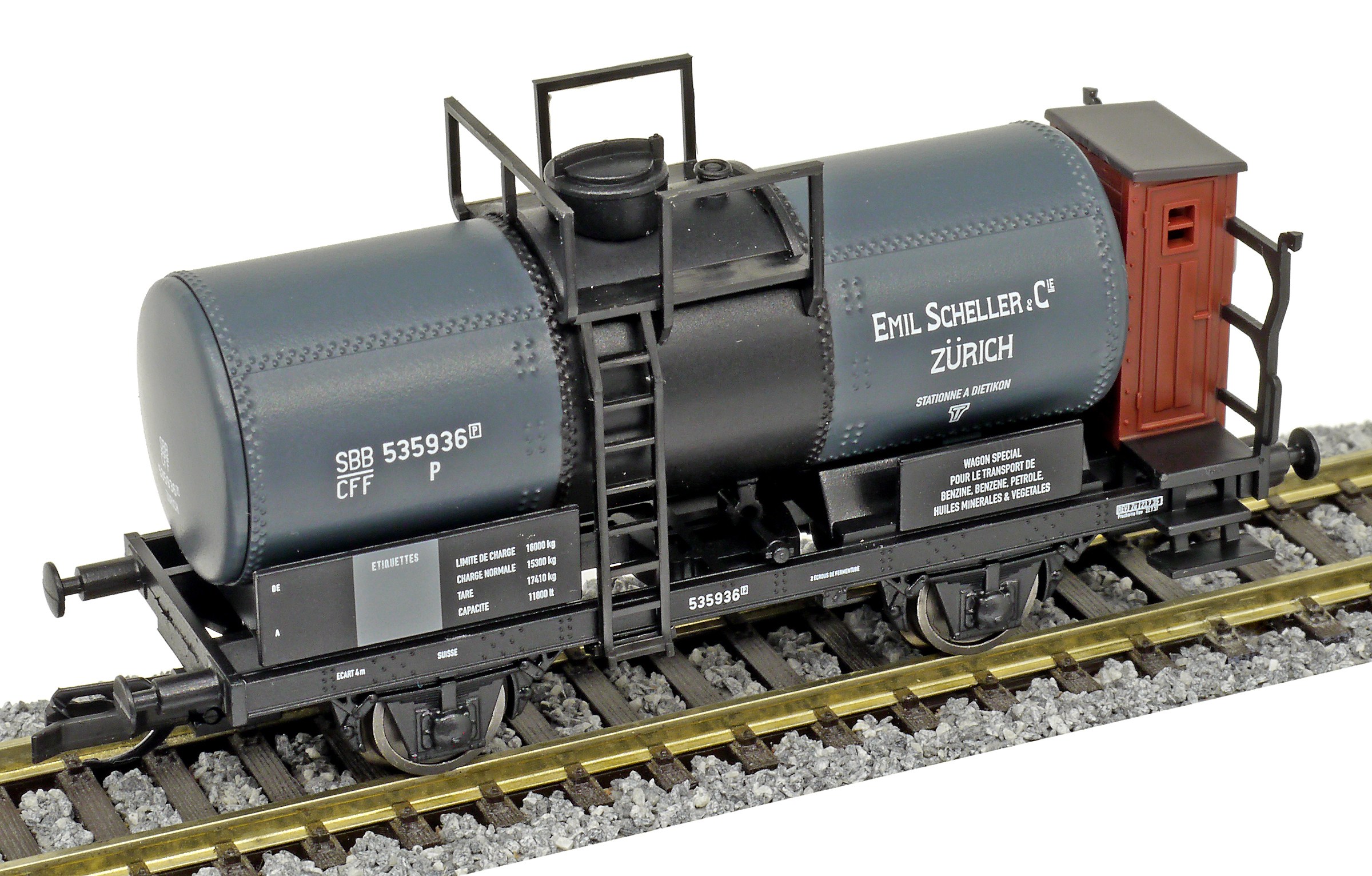 | kotlový vůz tmavě šedý s brzdařskou budkou „E. Scheller & Cie, Zürich“ |