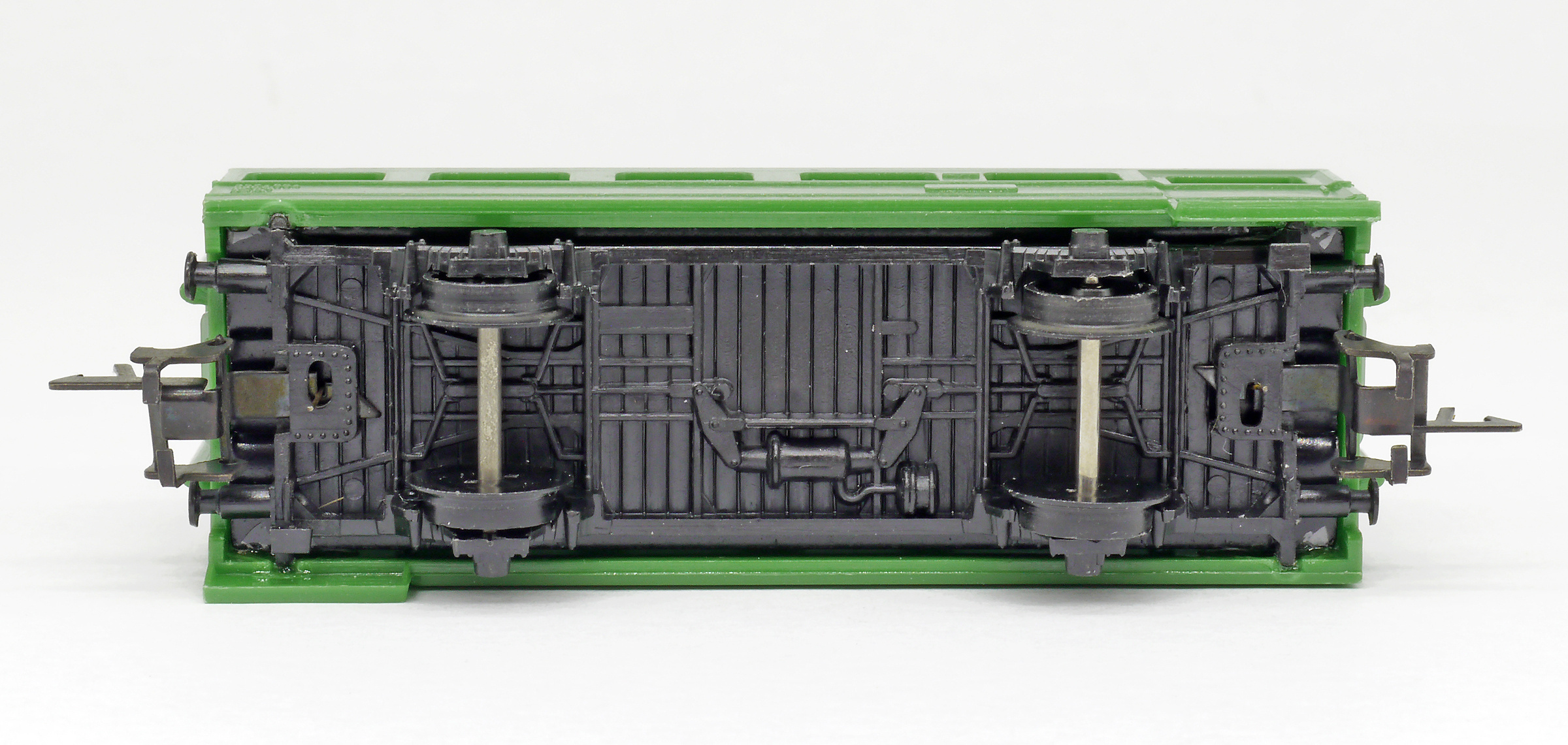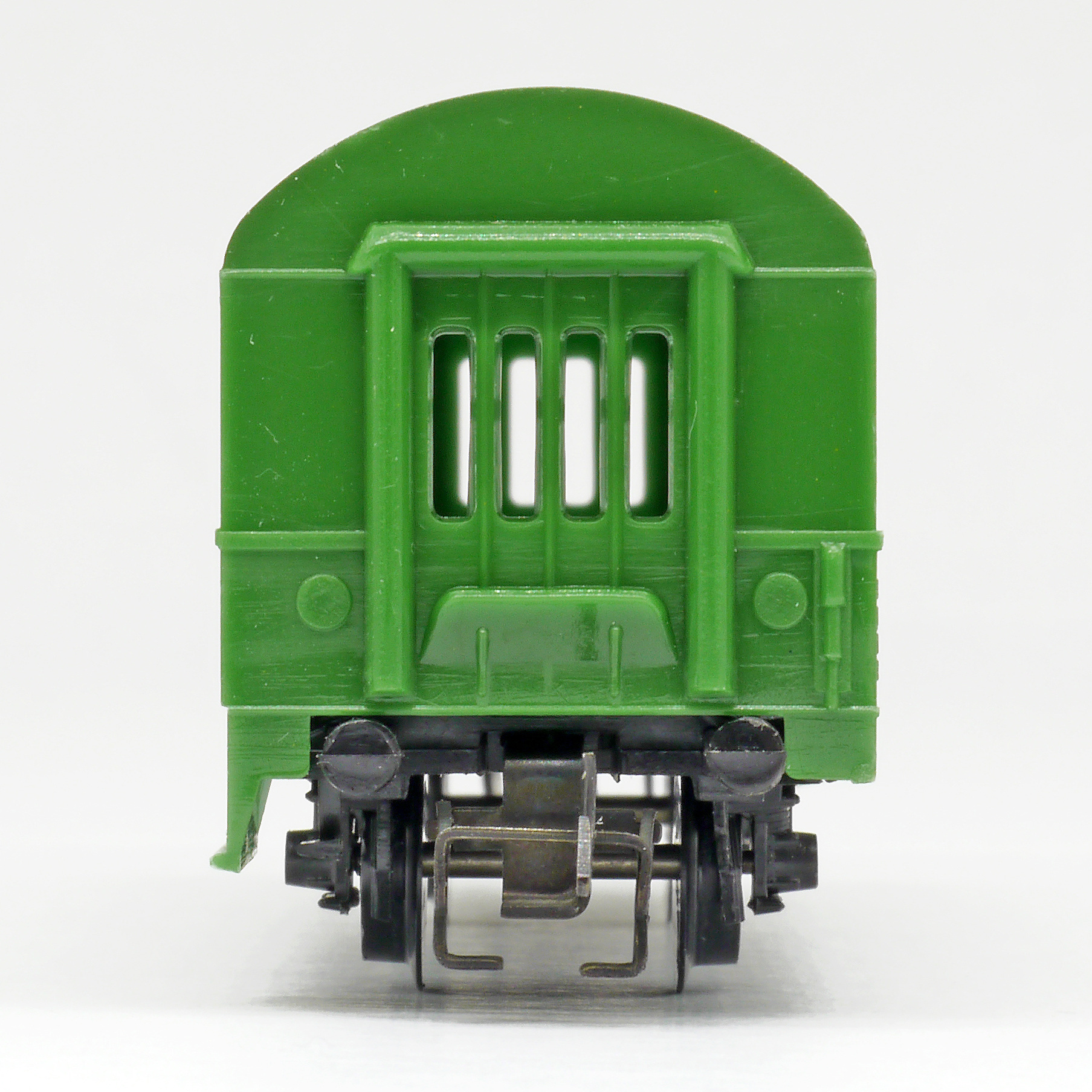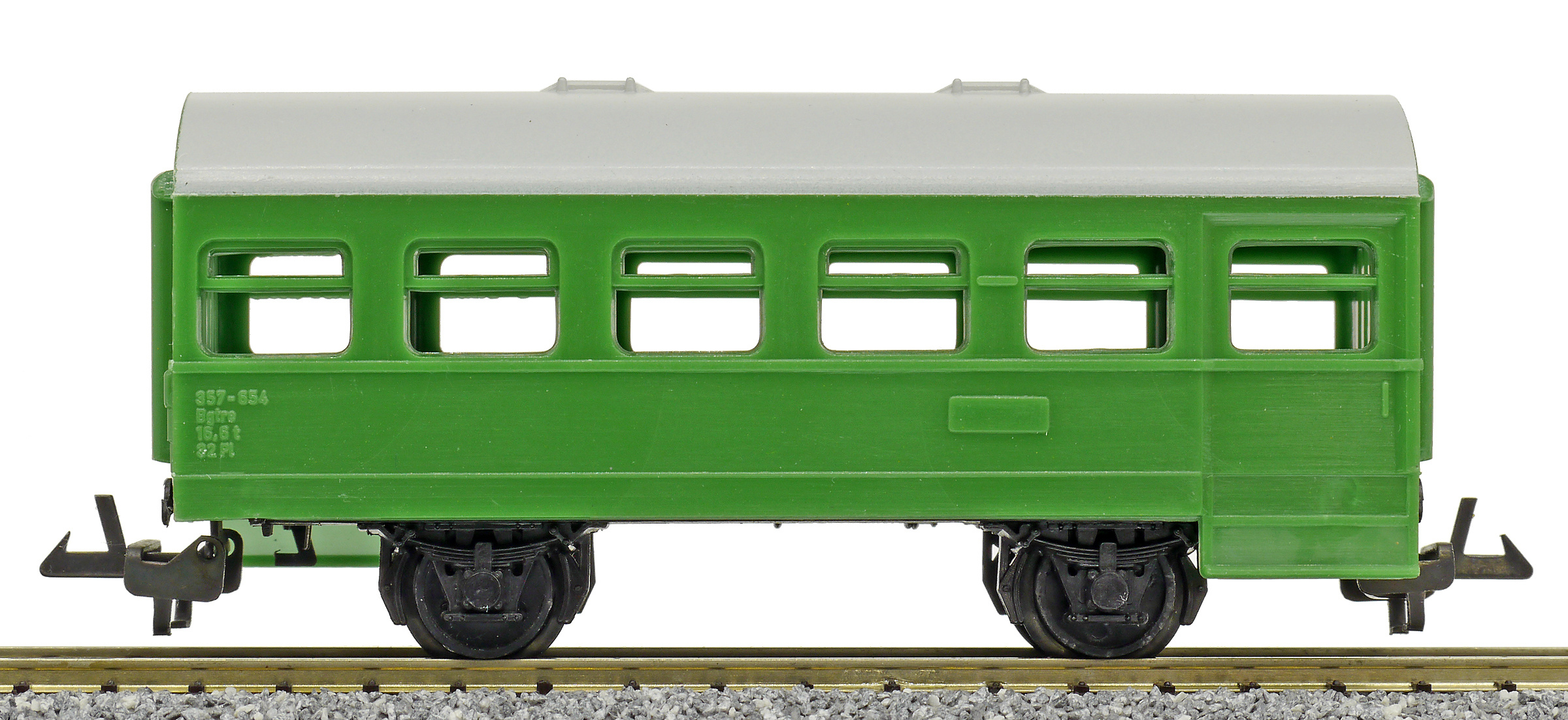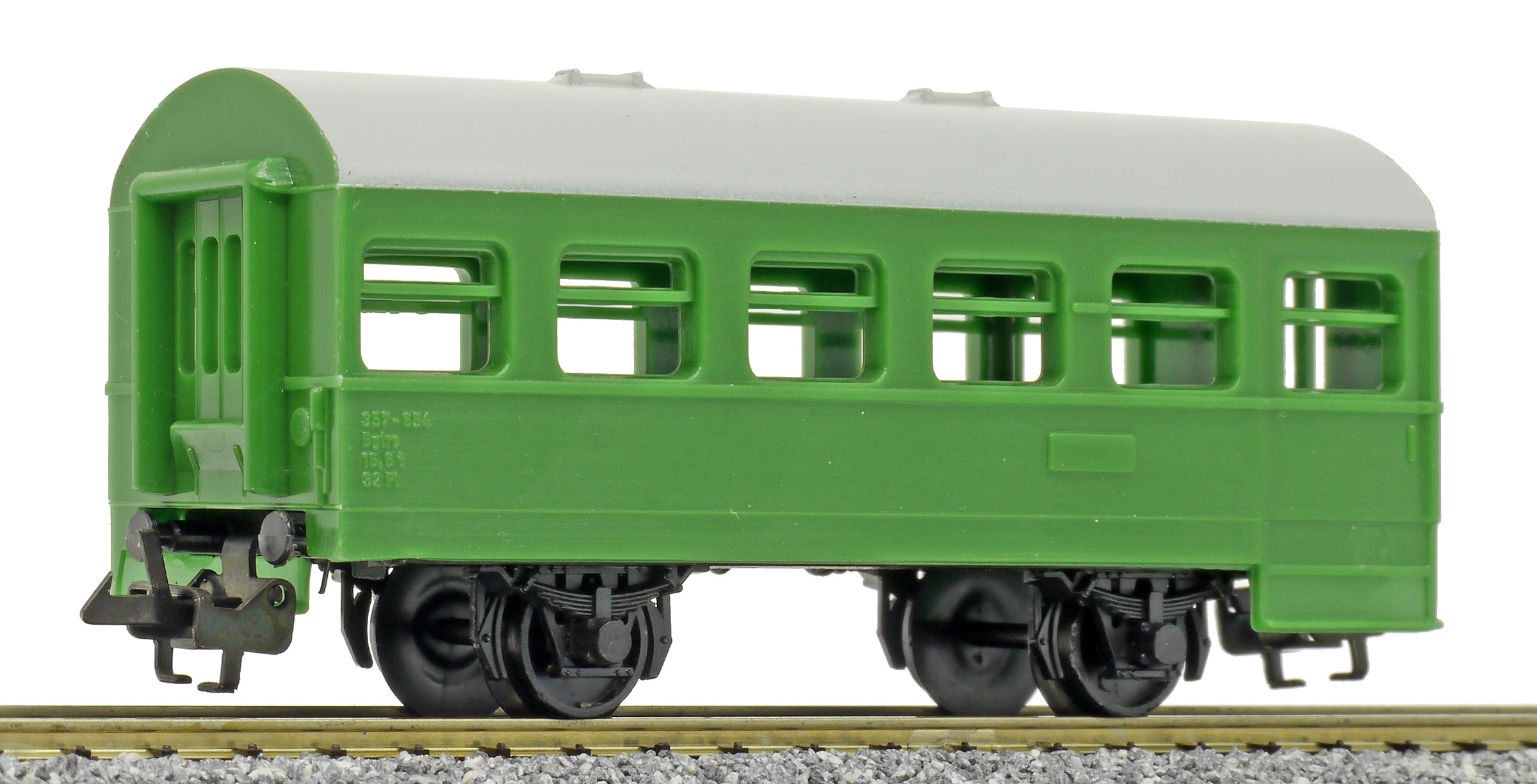 Popis   osobní vůz zelený v barvě plastu bez zasklení s šedou střechou