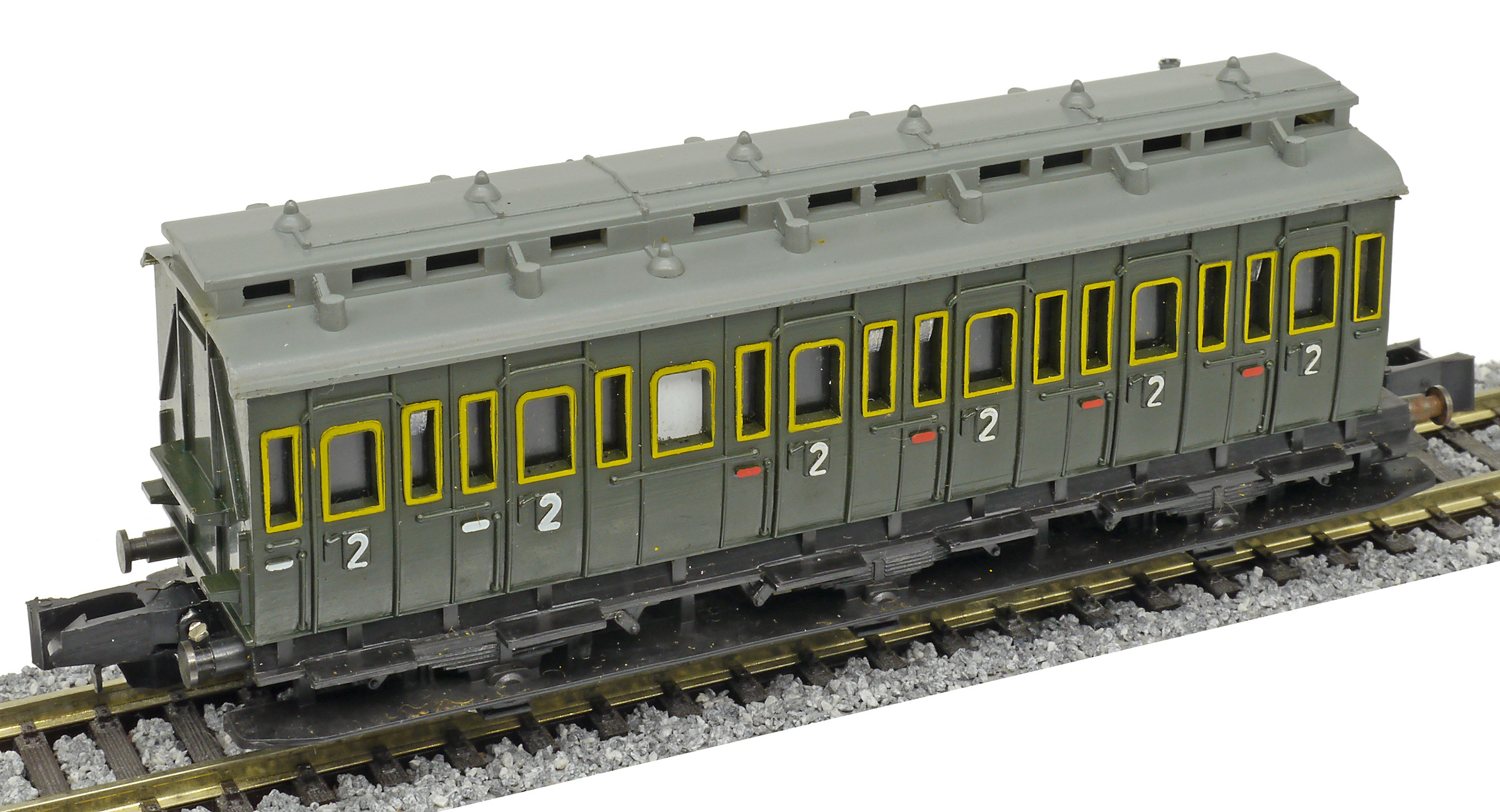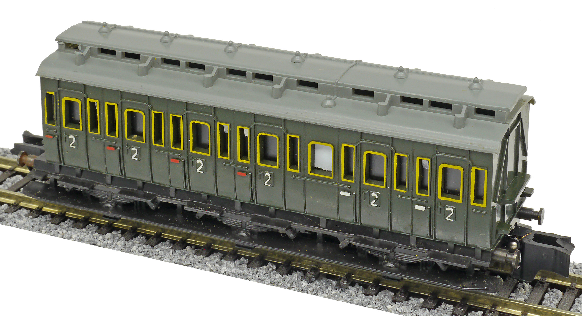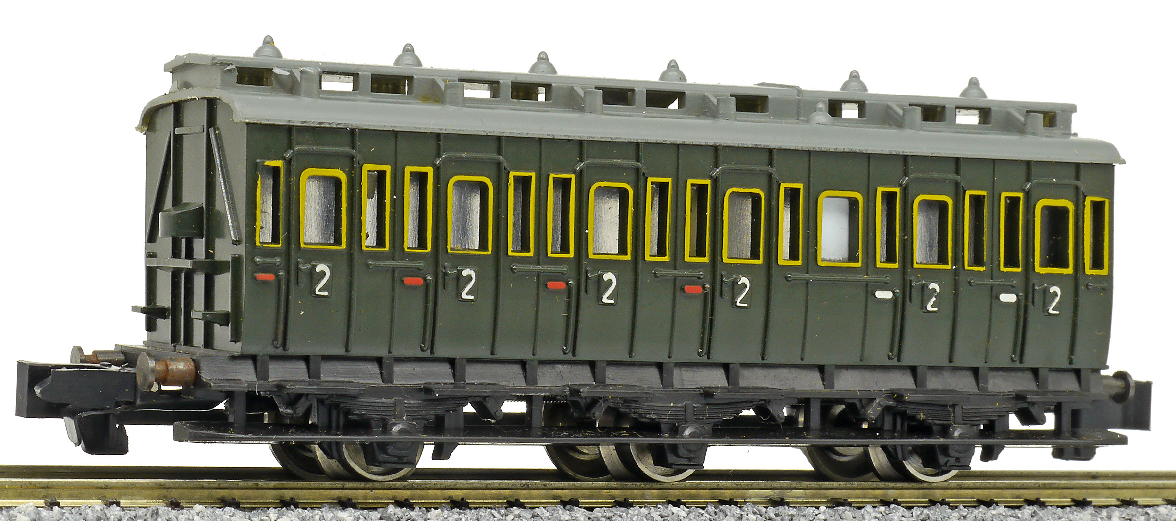 oddílový osobní vůz zelený s šedou střechou 2. tř.