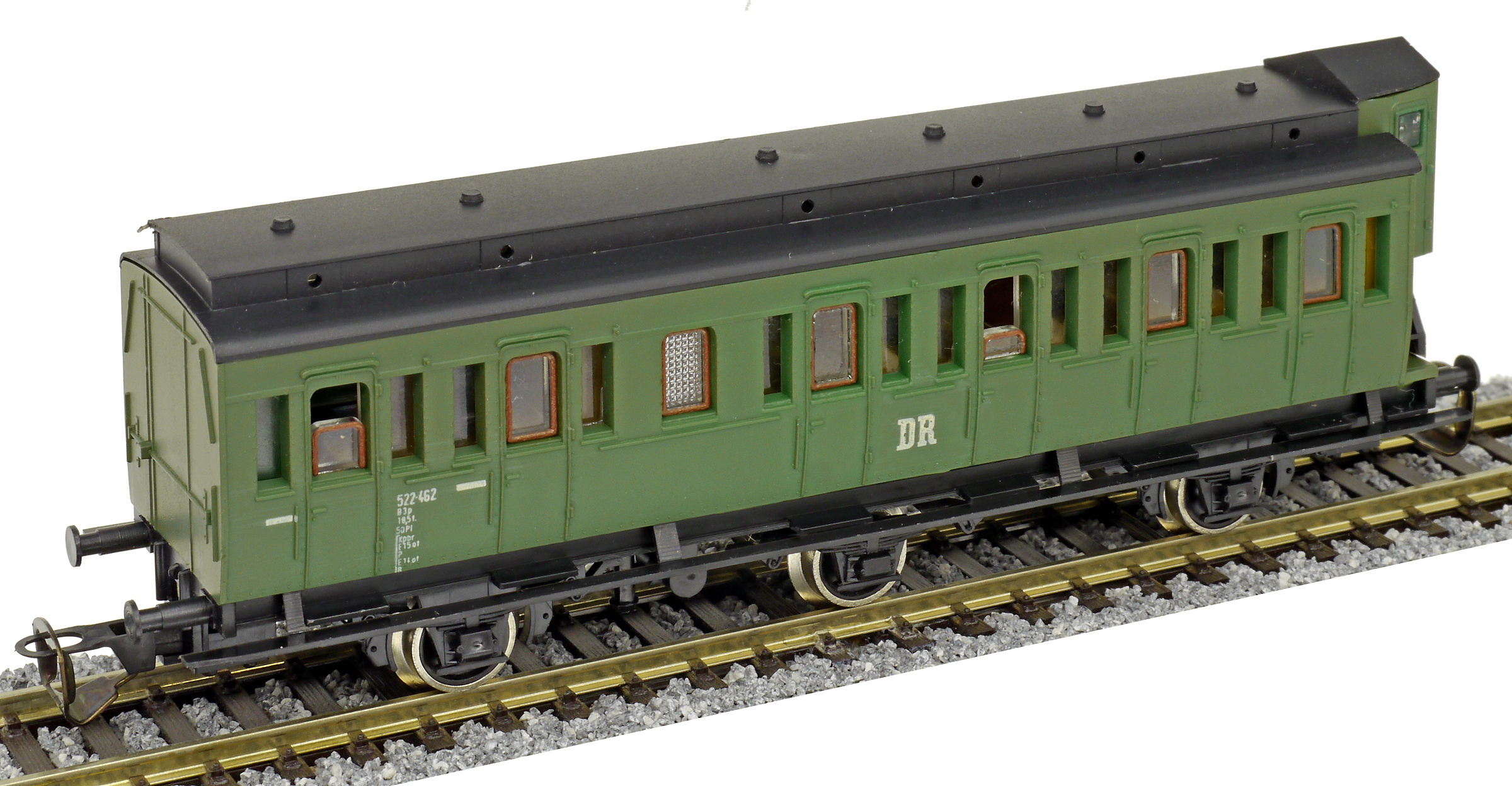 Popis   oddílový osobní vůz zelený s černou střechou a s brzdařskou budkou