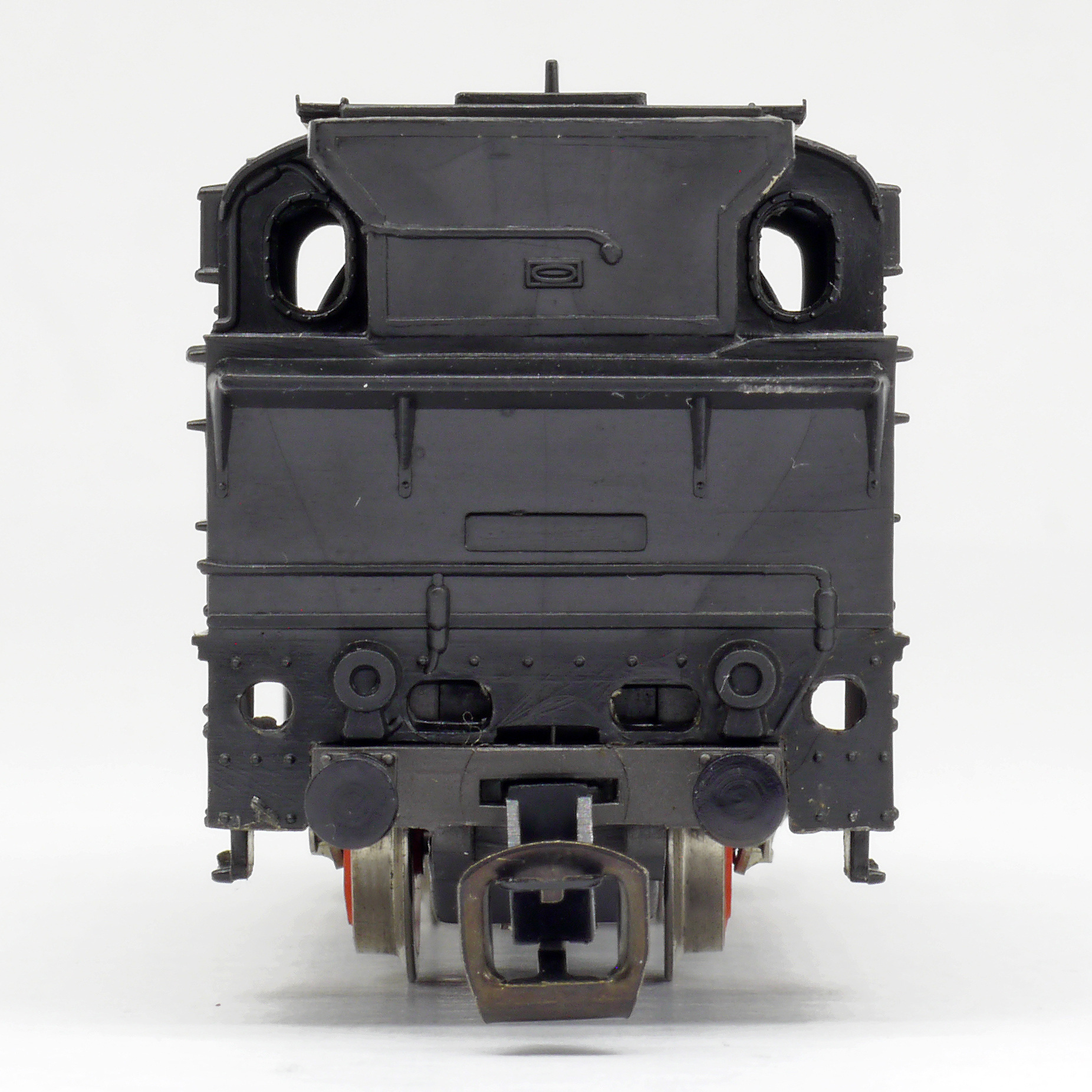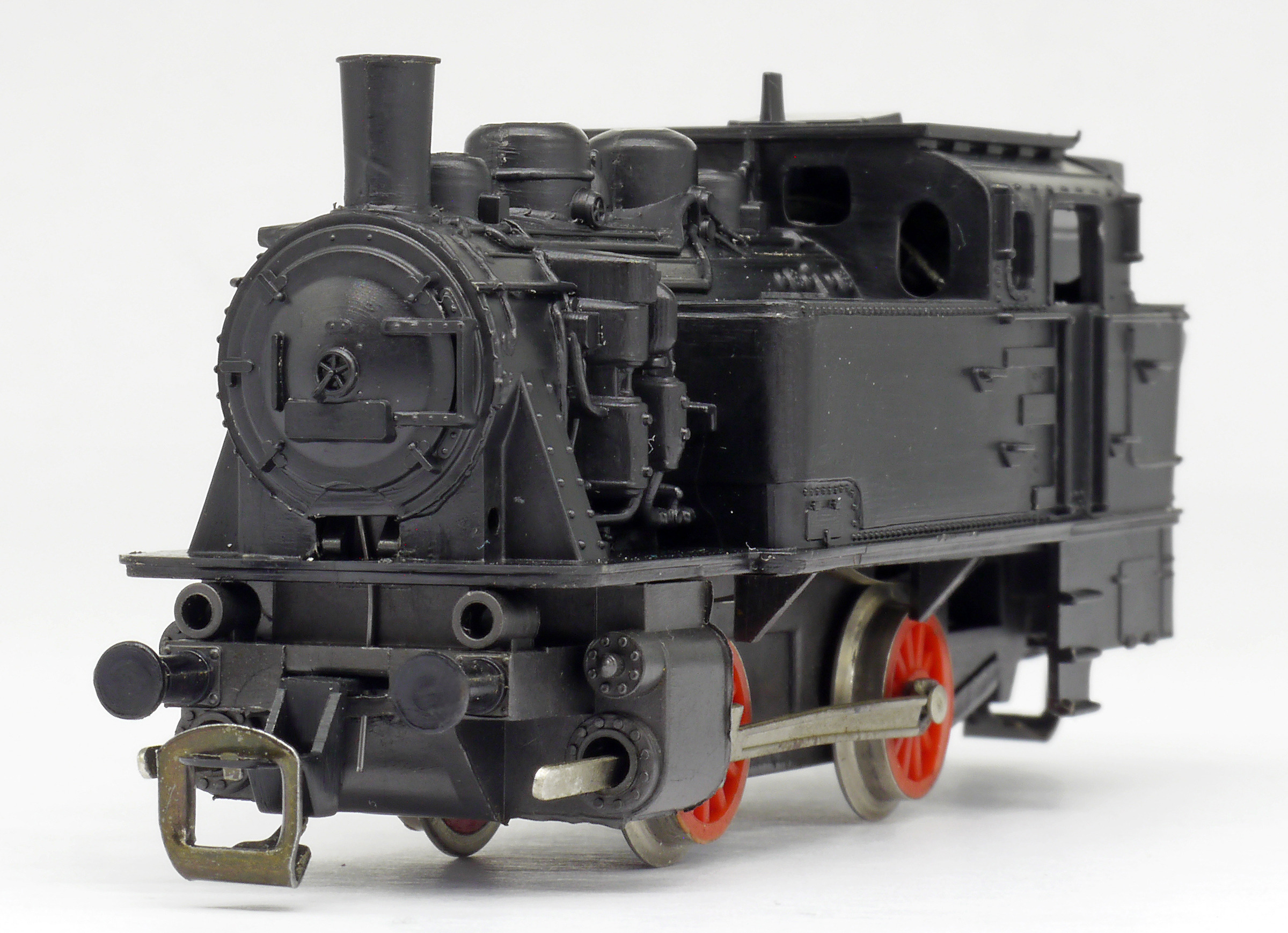 | parní lokomotiva černá v barvě plastu bez potisku, zjednodušený rozvod |
