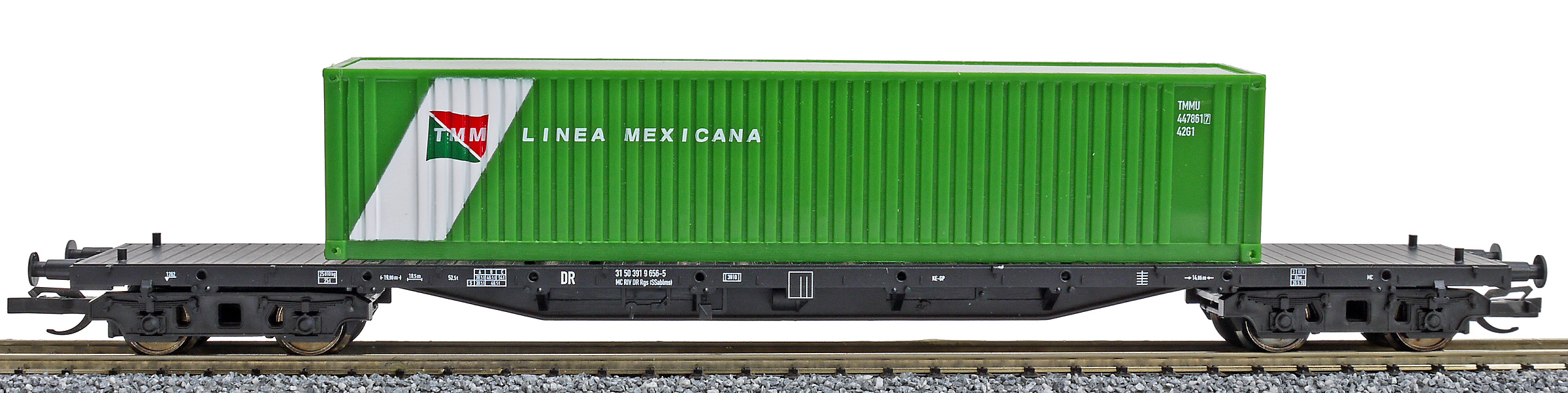 | nákladní plošinový vůz černý s kontejnerem 40' „LINE MEXICANA“ |