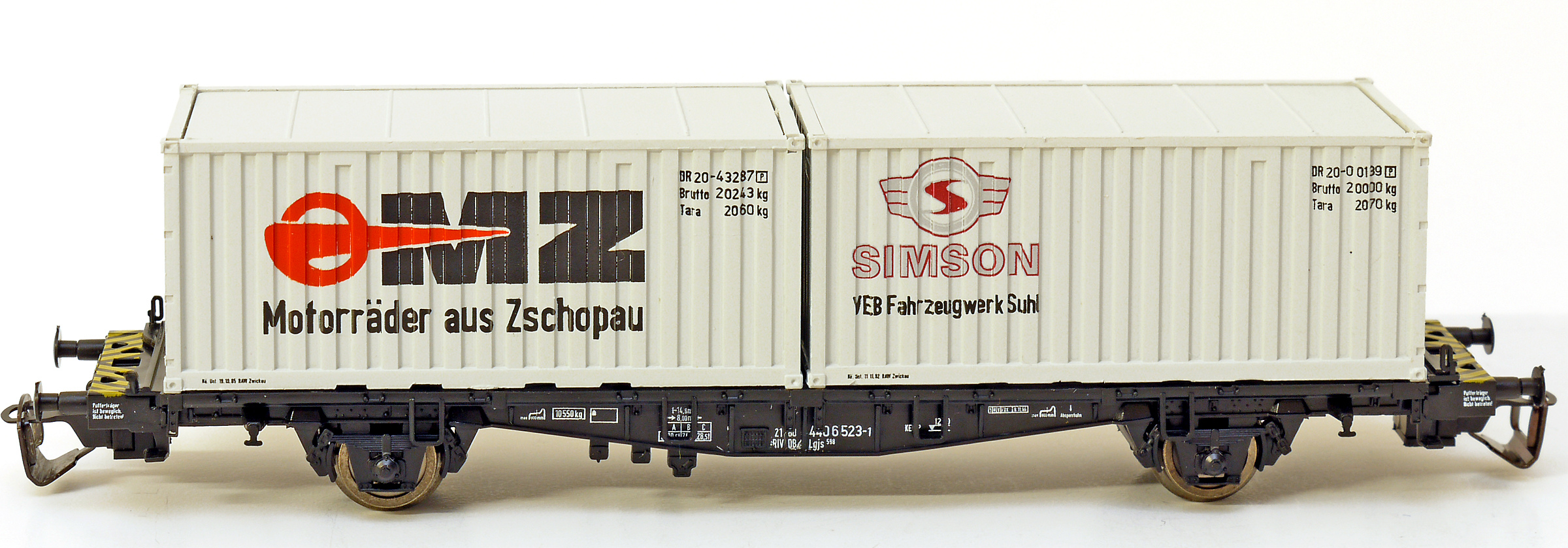 | plošinový nákladní vůz černý se dvěma kontejnery 20' „Simson“ a „MZ“ |