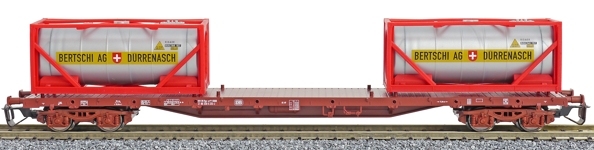 | nákladní plošinový vůz červenohnědý se dvěma cisternovými kontejnery „BERTSCHI“ |