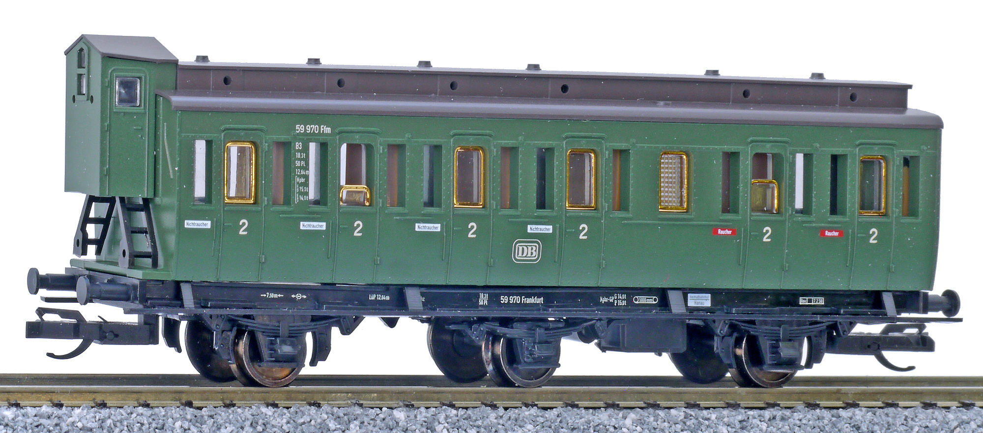 | oddílový osobní vůz zelený s černou střechou a brzdařskou budkou 2. tř. |