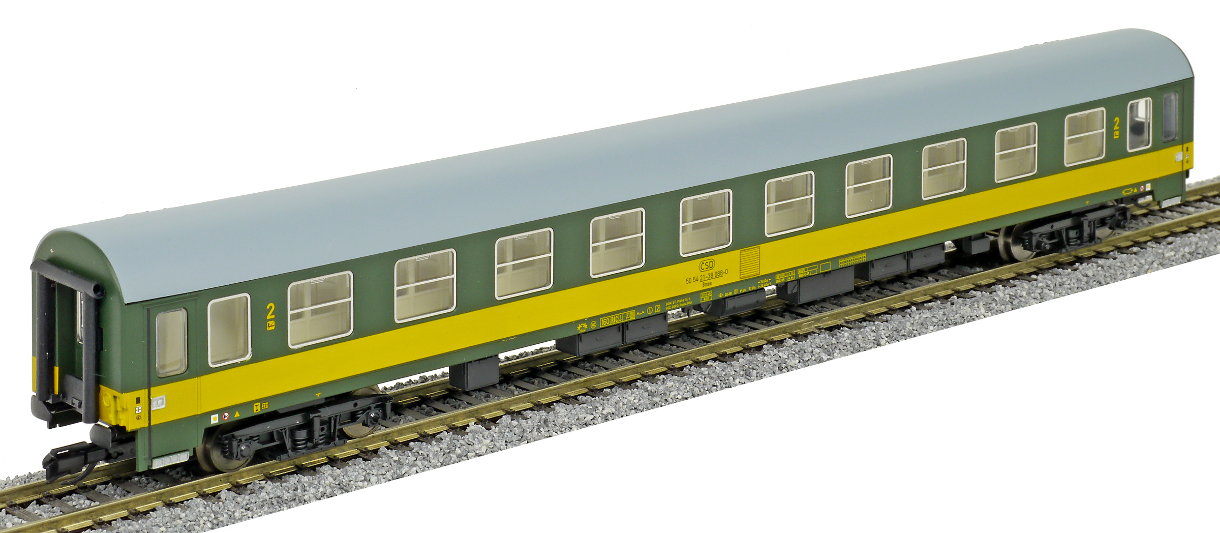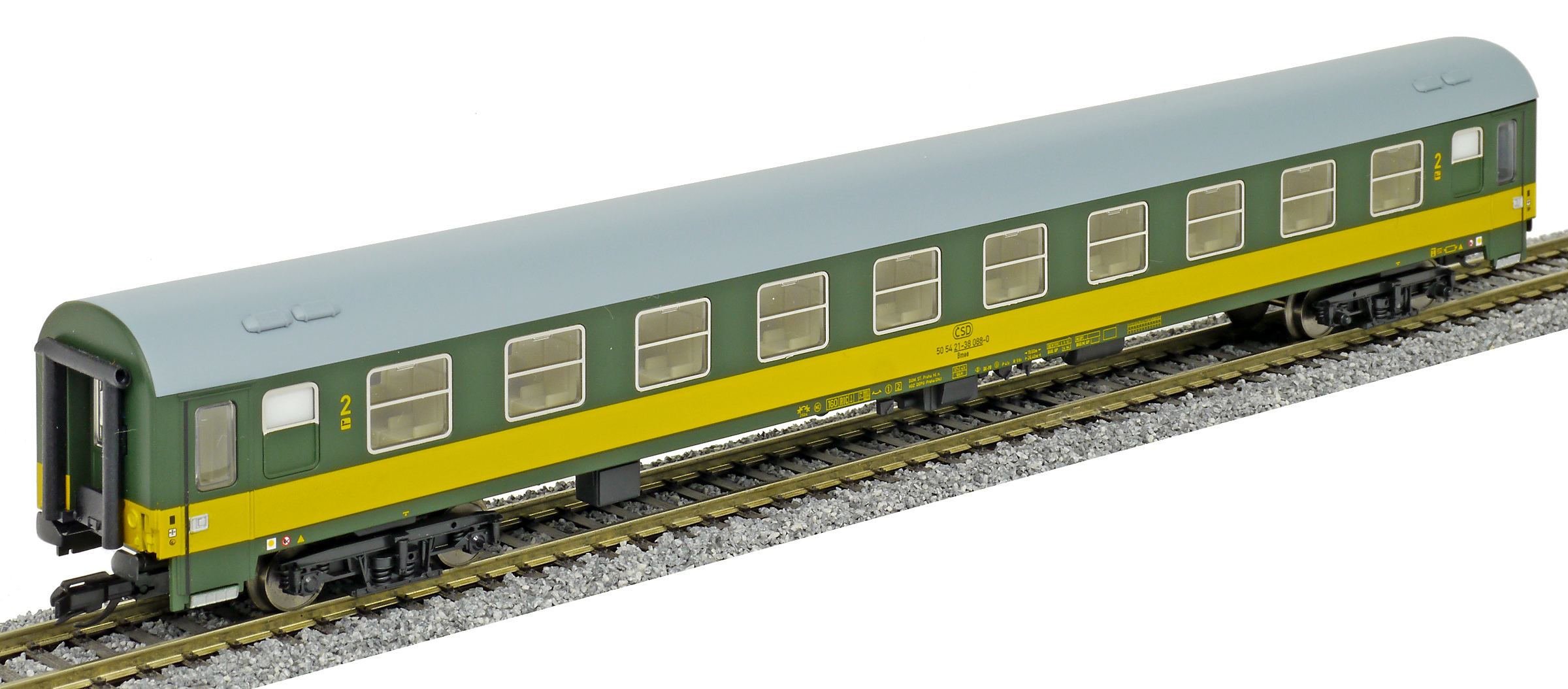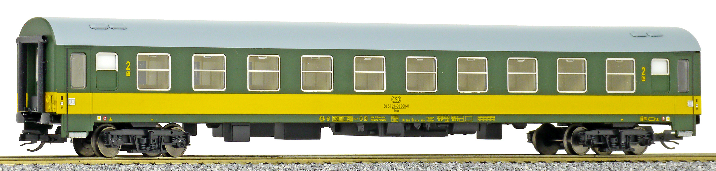 | rychlíkový vůz zelený se žlutým pruhem a šedou střechou 2. tř. |
