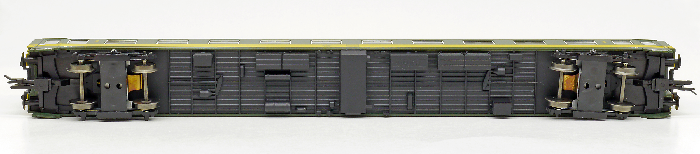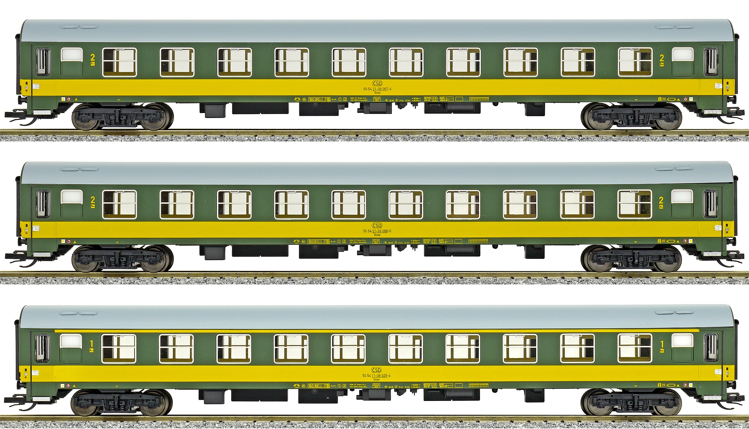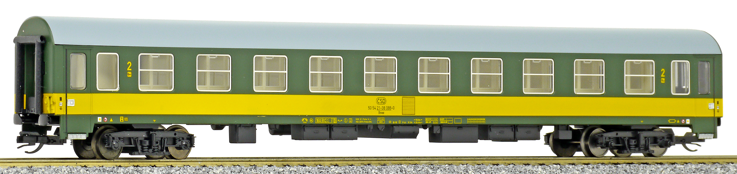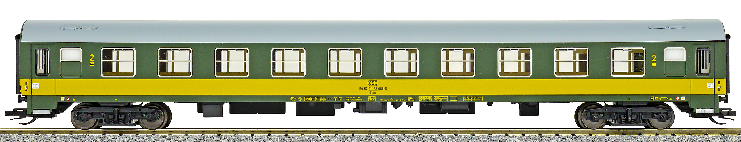 | rychlíkový vůz zelený se žlutým pruhem a šedou střechou 2. tř. |
