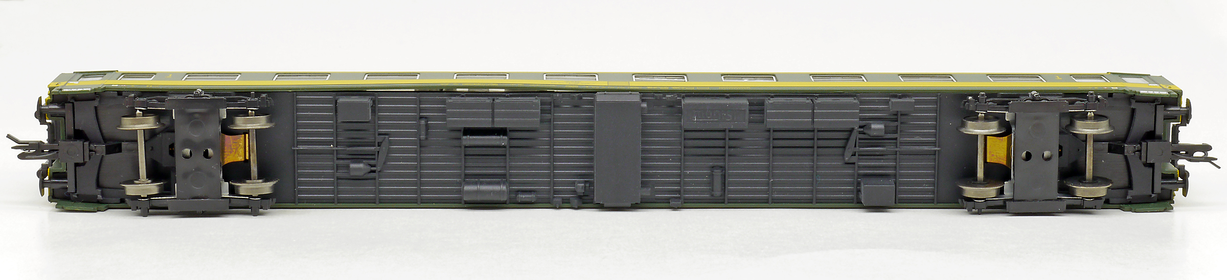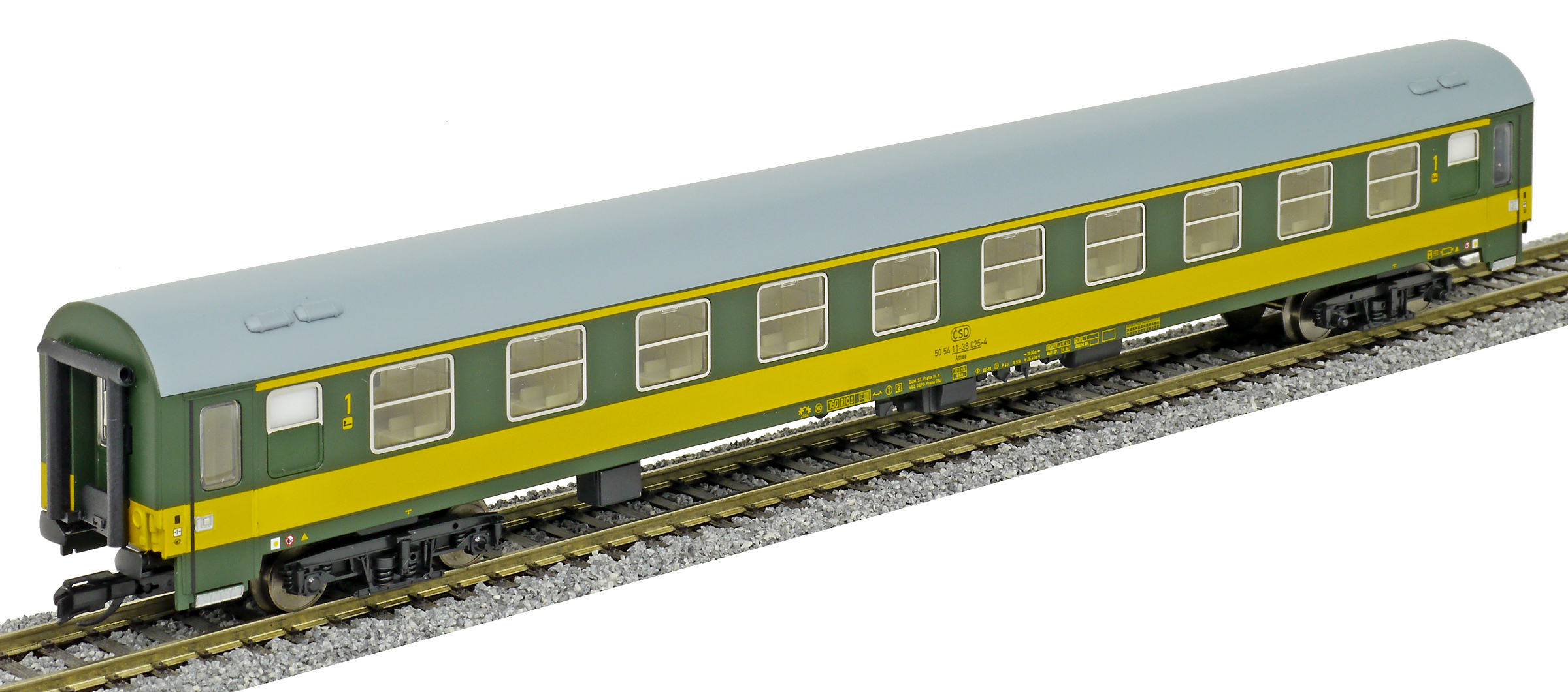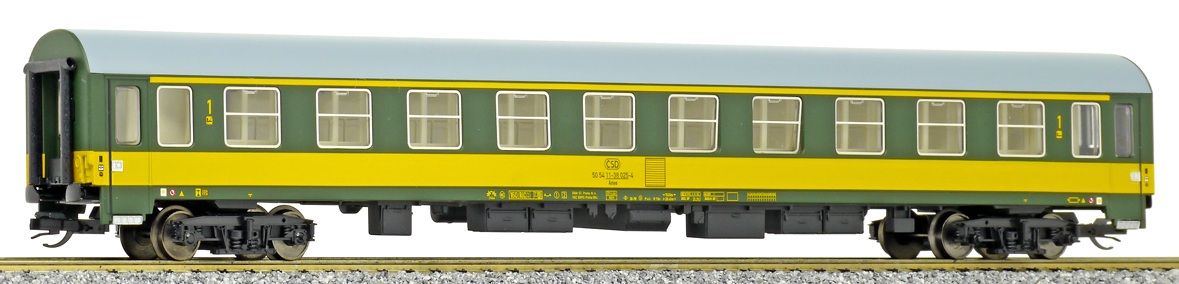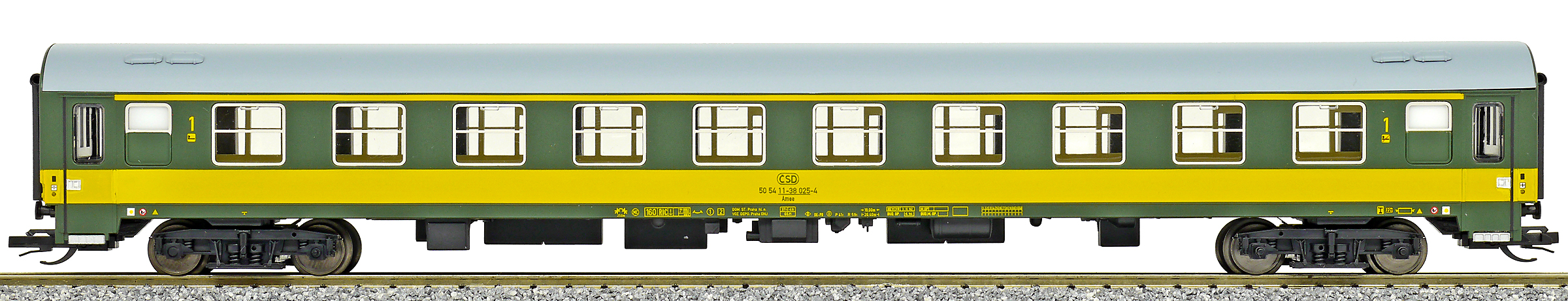 | rychlíkový vůz zelený se žlutým pruhem a šedou střechou 1. tř. |