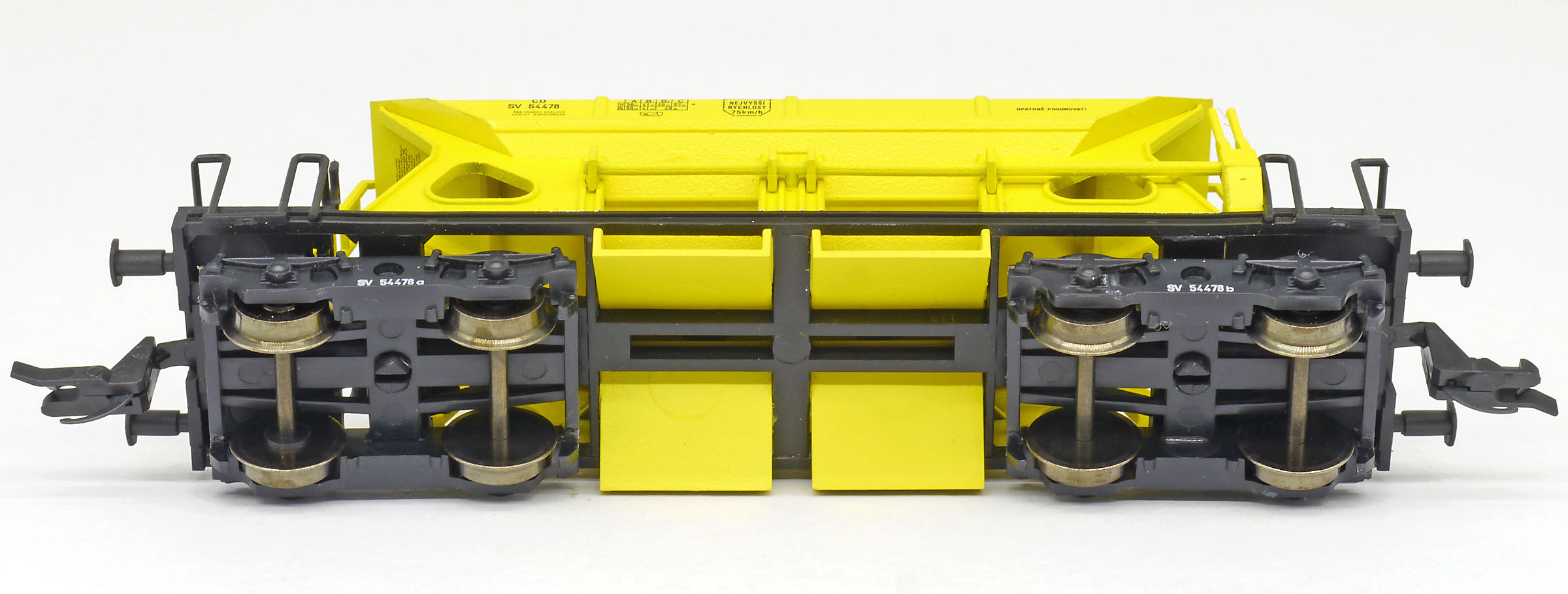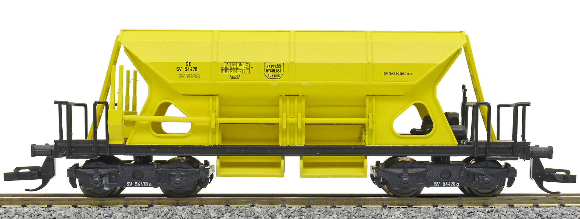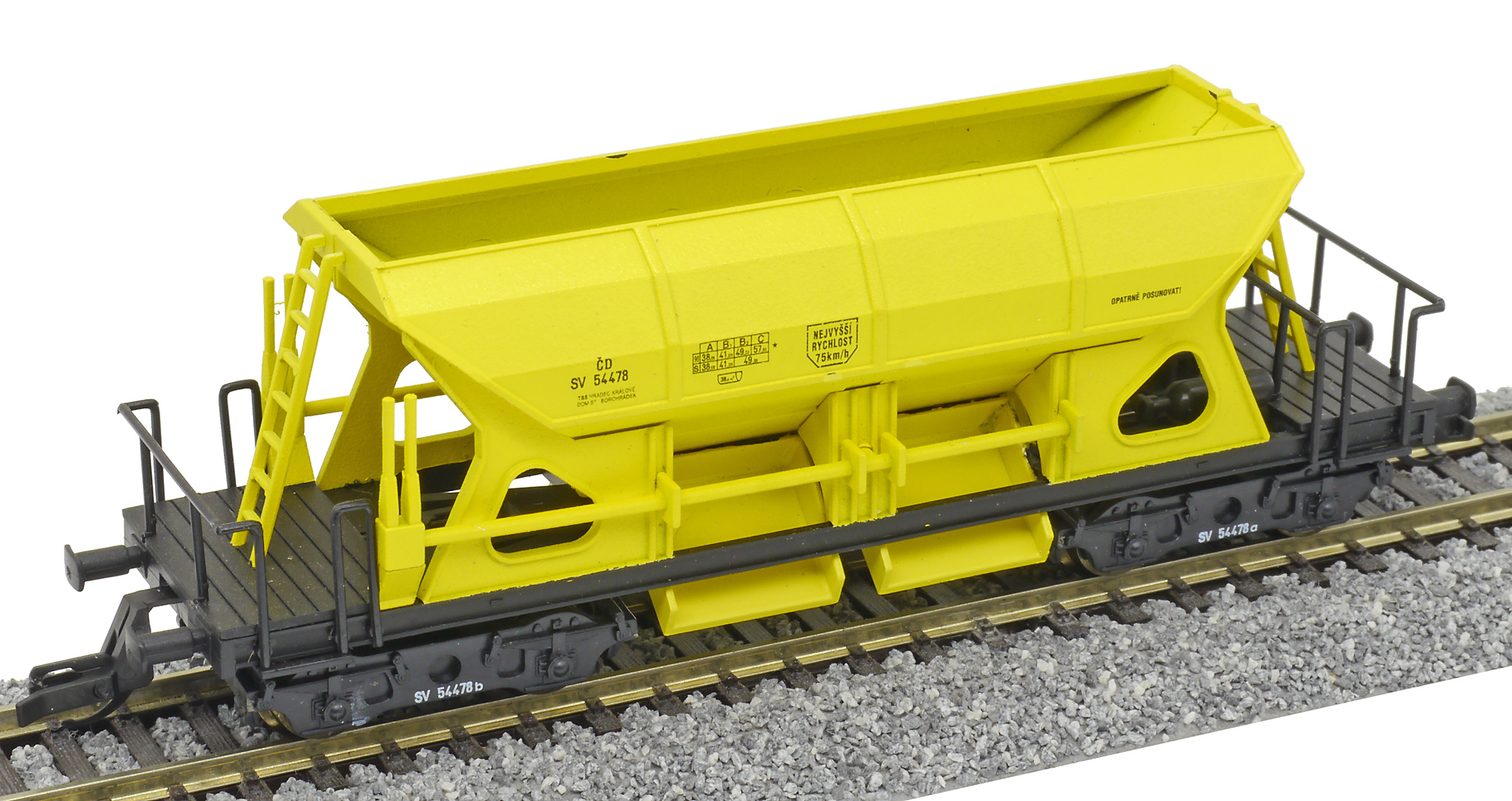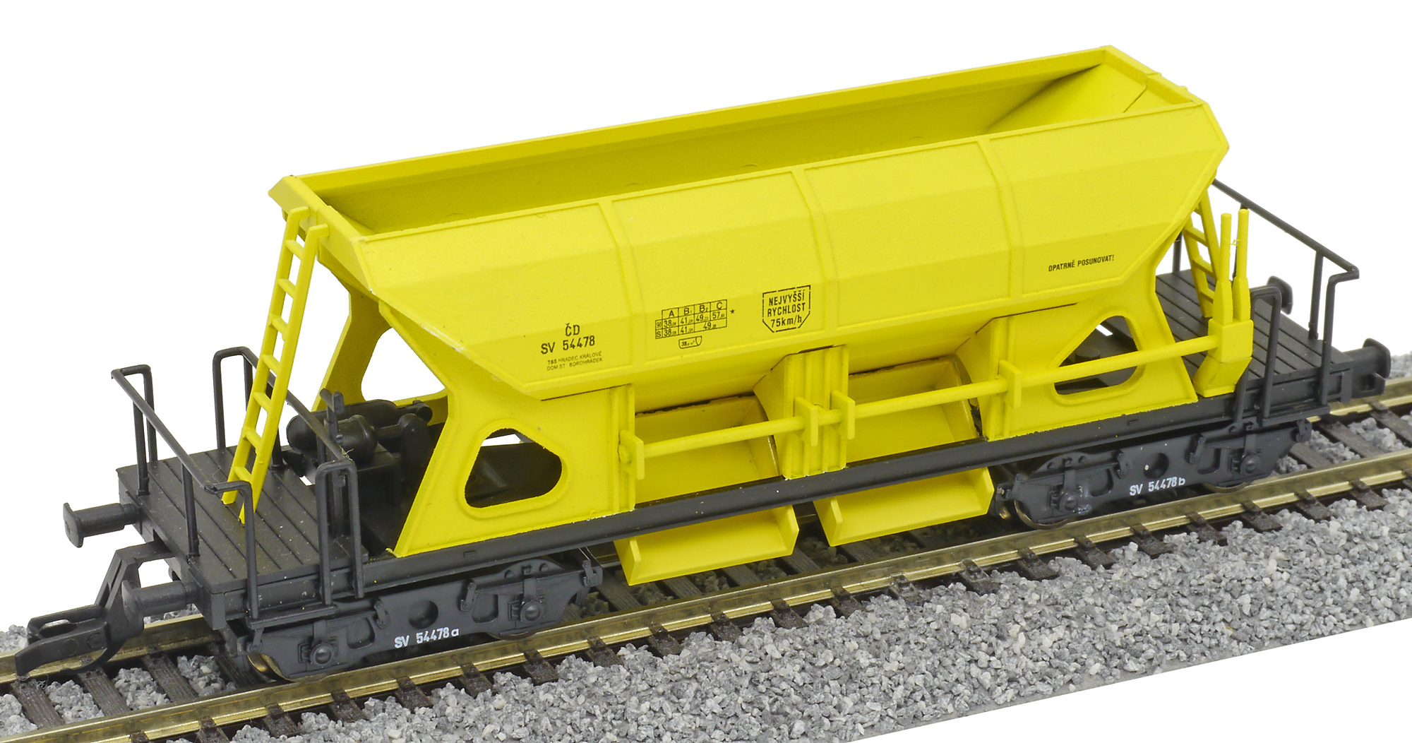 nákladní samovýsypný pracovní vůz žlutý s černým rámem a podvozky