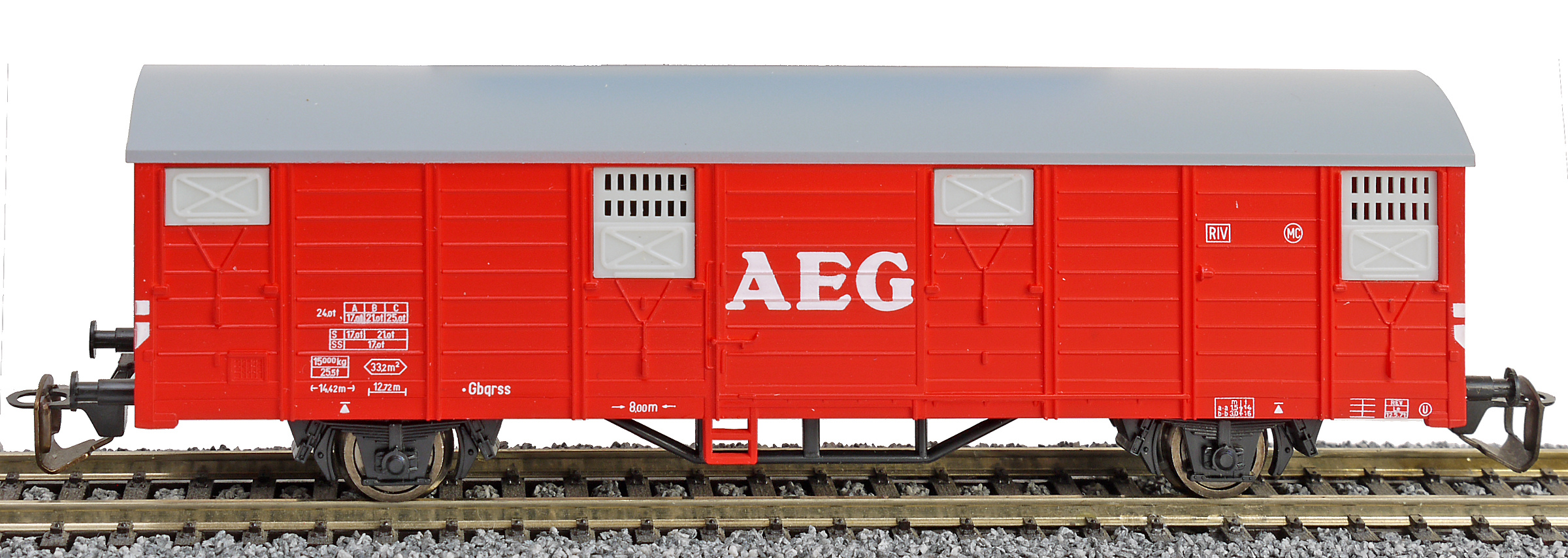 krytý nákladní vůz červený s šedou střechou „AEG“