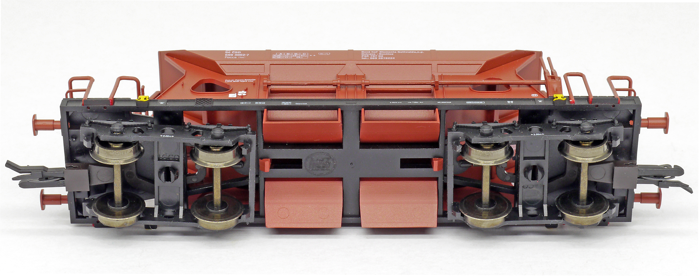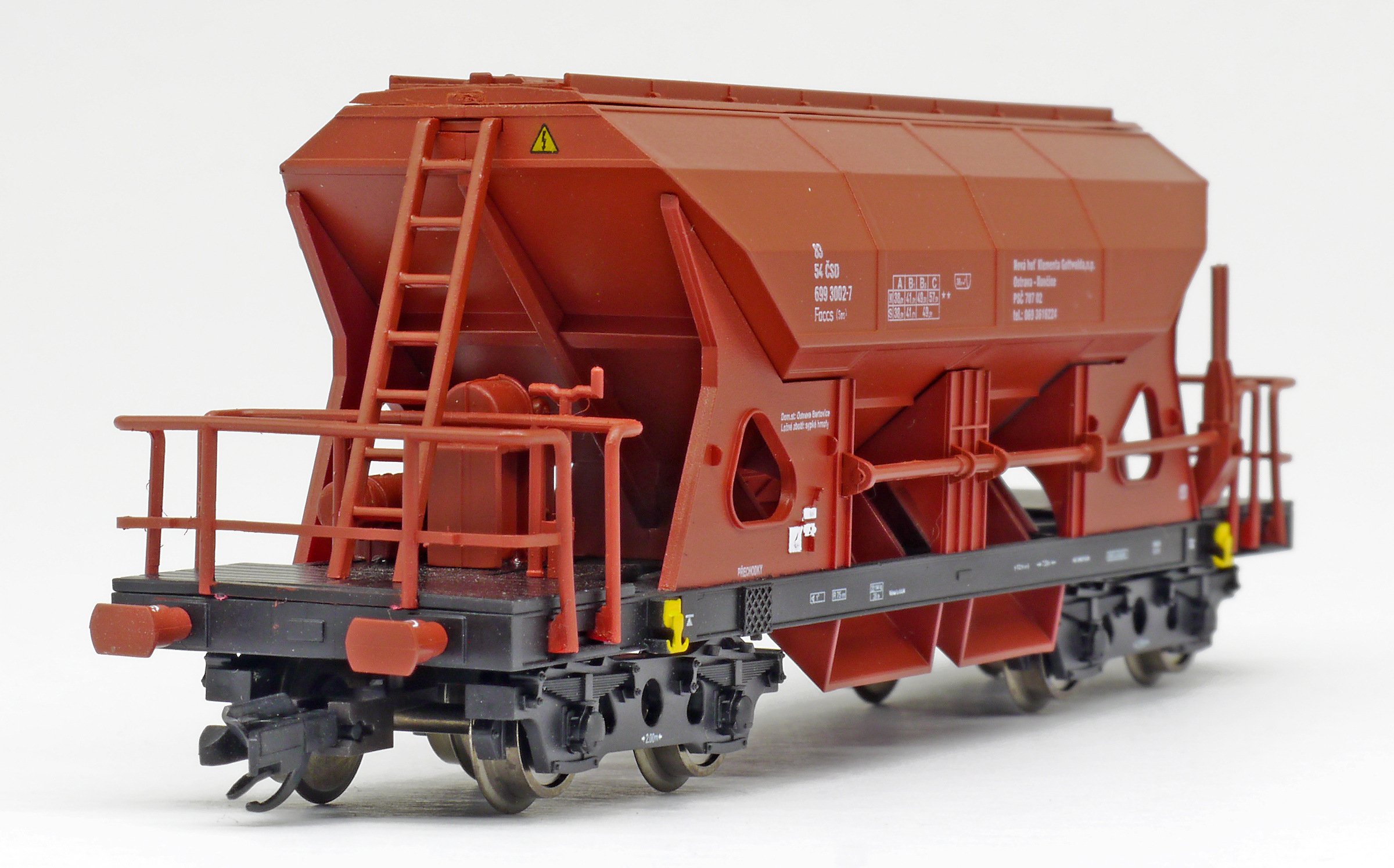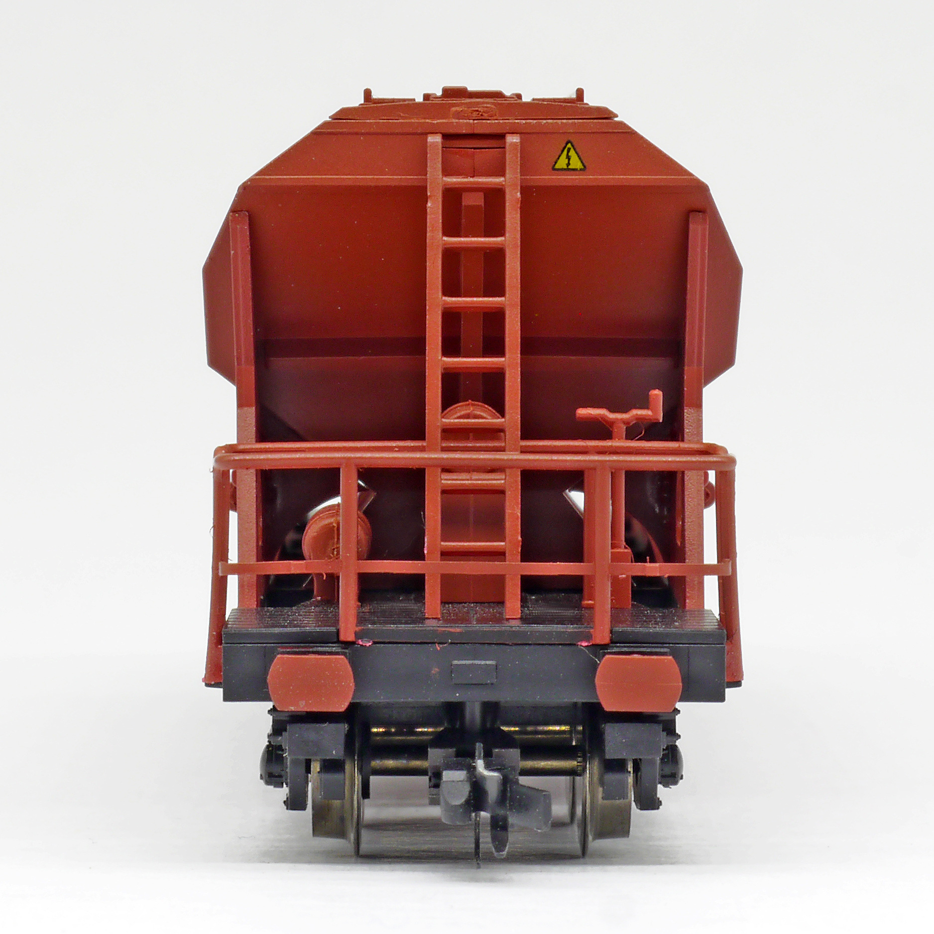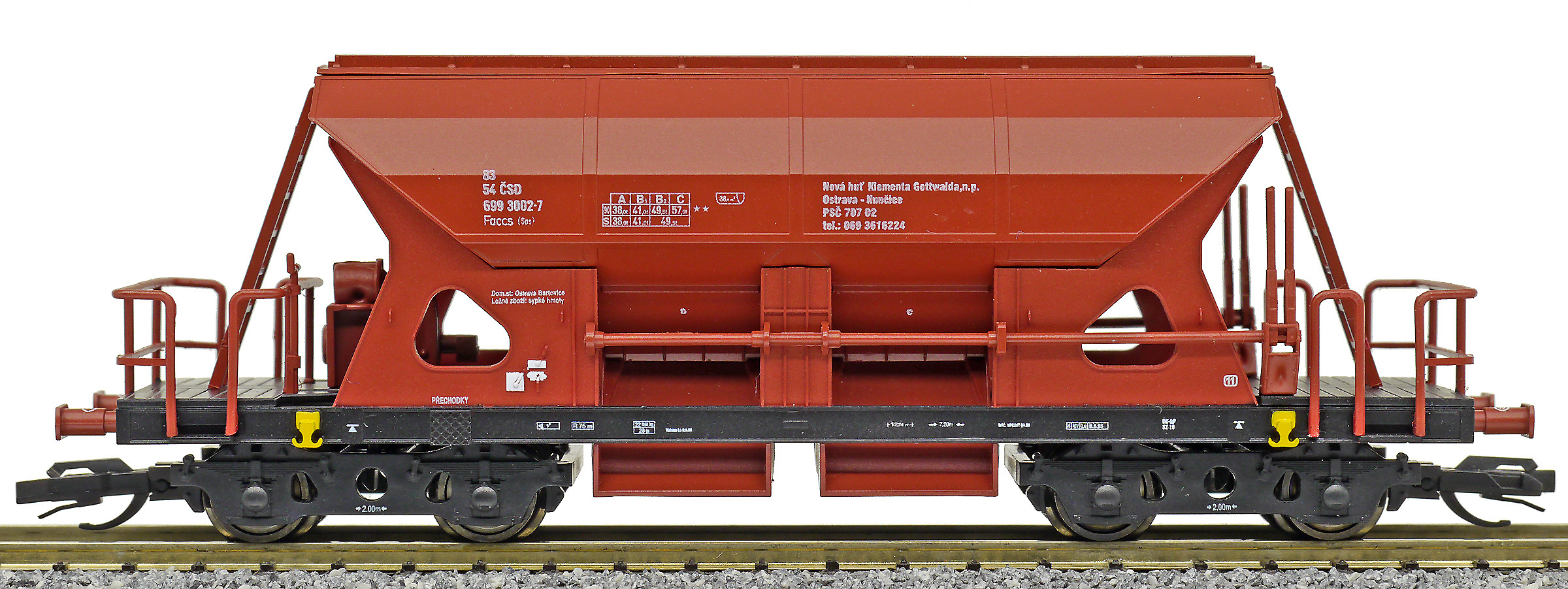 | nákladní samovýsypný vůz červenohnědý s černým rámem, s klapkami „NHKG Ostrava-Kunčice“ |