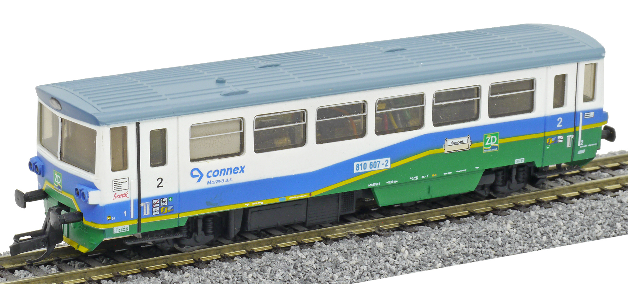 | zelený-modrý-bílý s šedou střechou „Železnice Desná“, označení „Šemík“ |