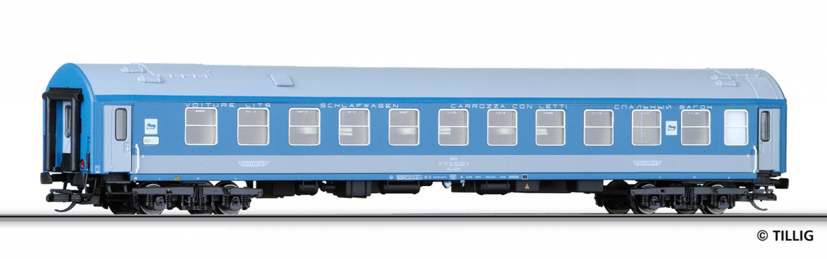 | lůžkový vůz modrý s šedým pruhem a střechou |