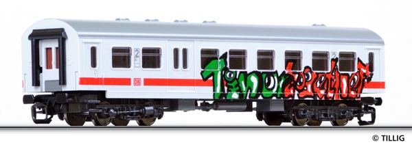 bílý s červeným pruhem a šedou střechou 2. tř., služební oddíl, s graffiti