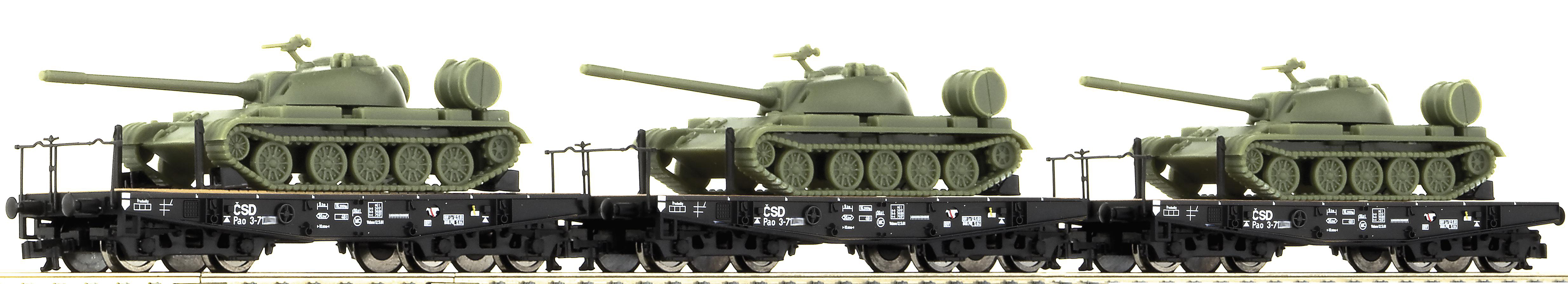 | set tří plošinových vozů s nákladem tanků T55 |