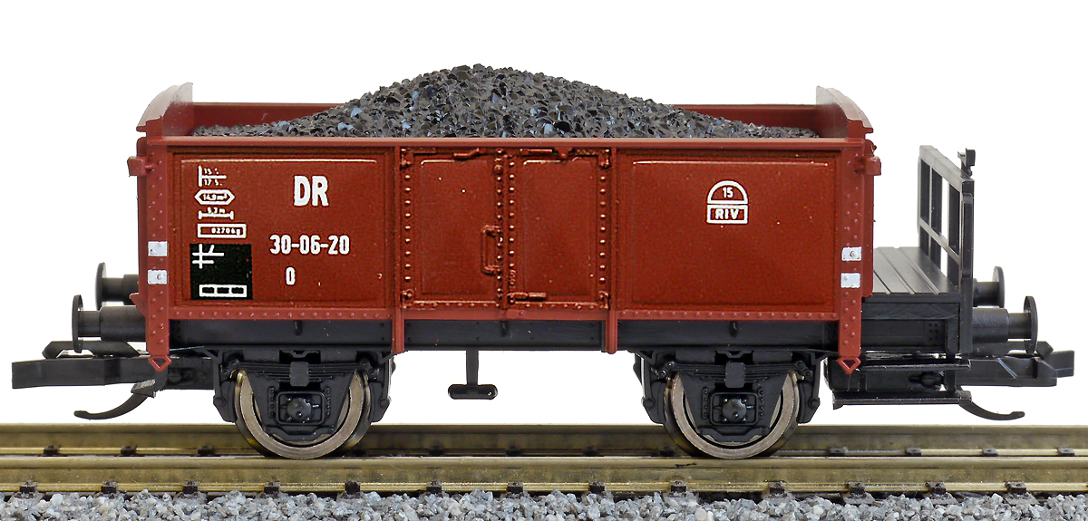 | červenohnědý s brzdařskou budkou a nákladem uhlí |