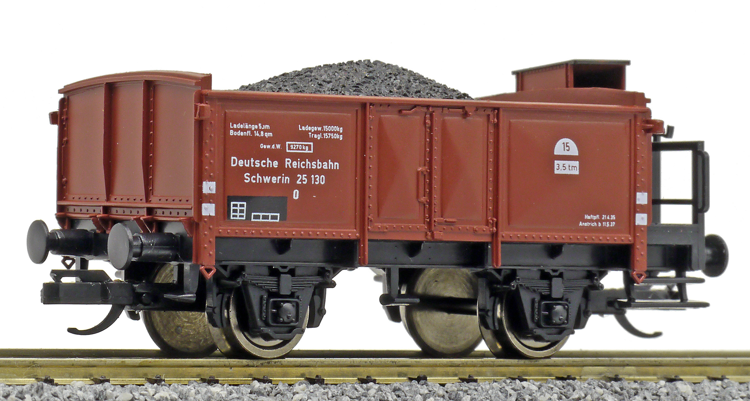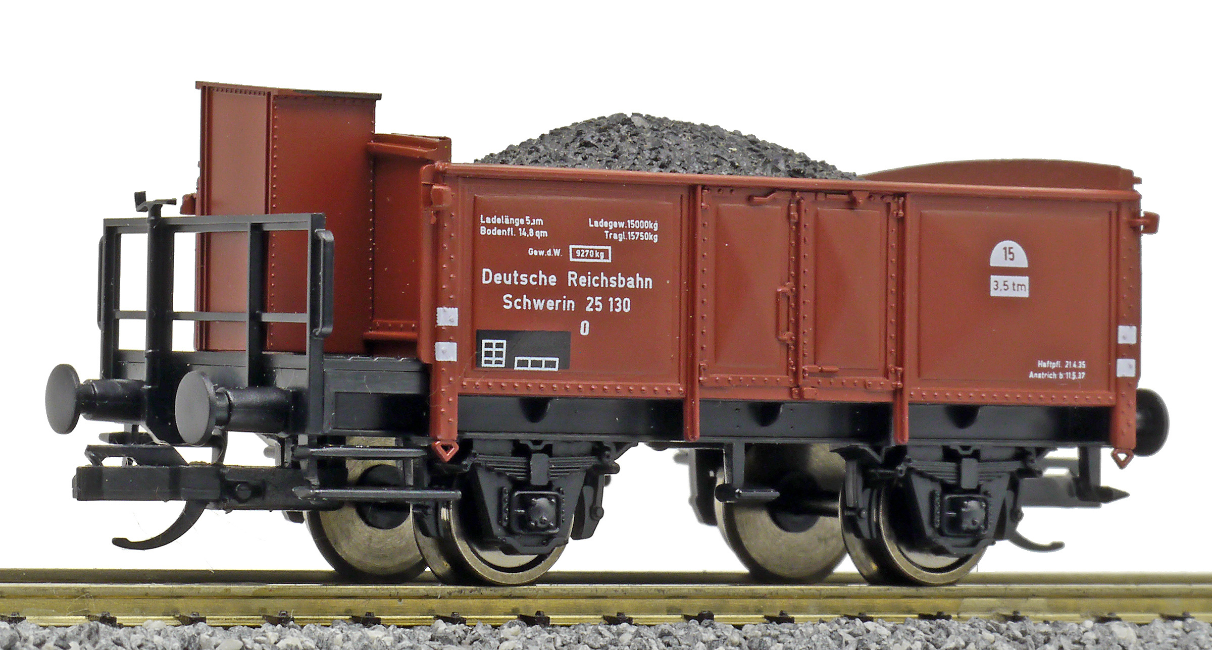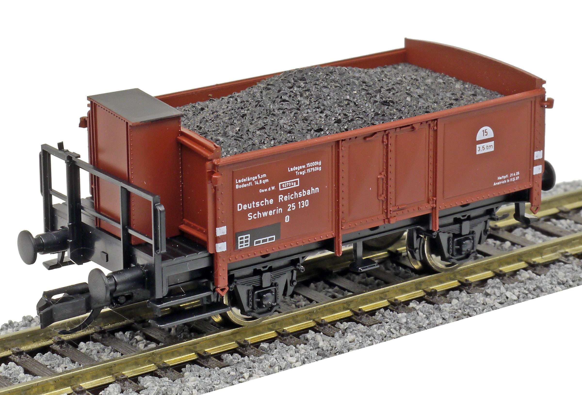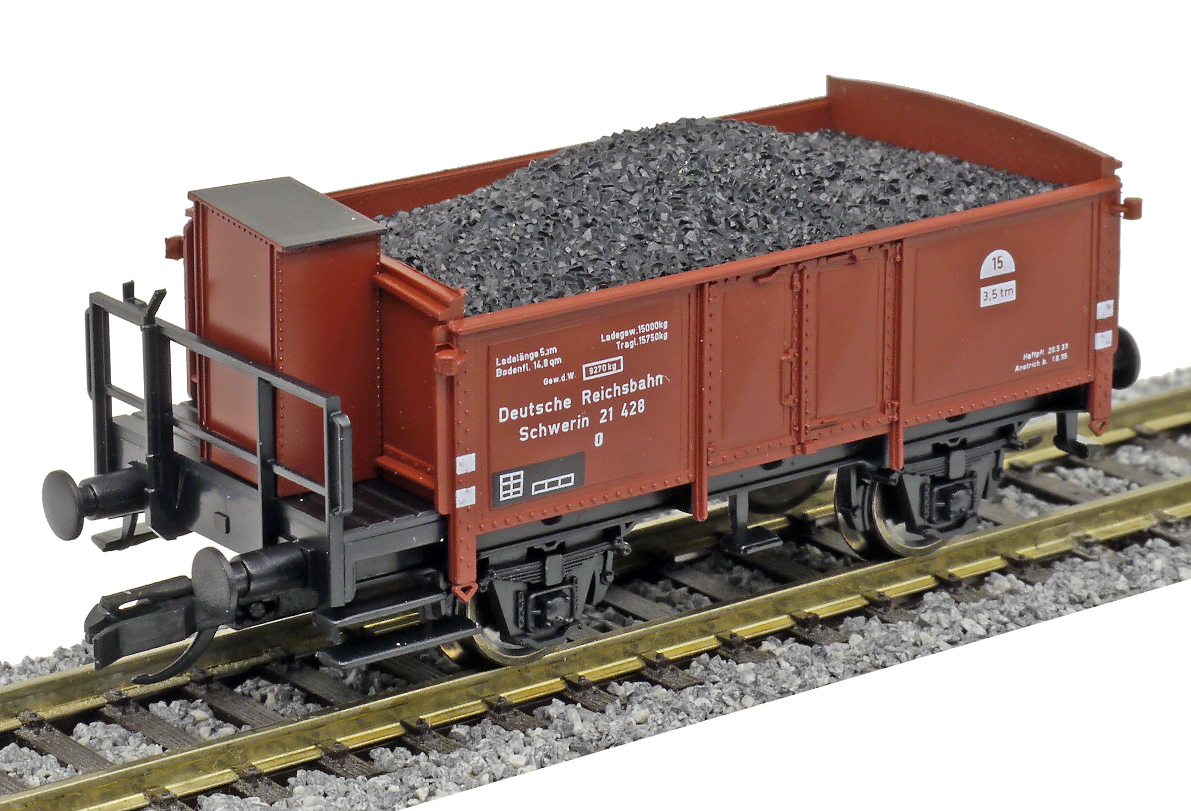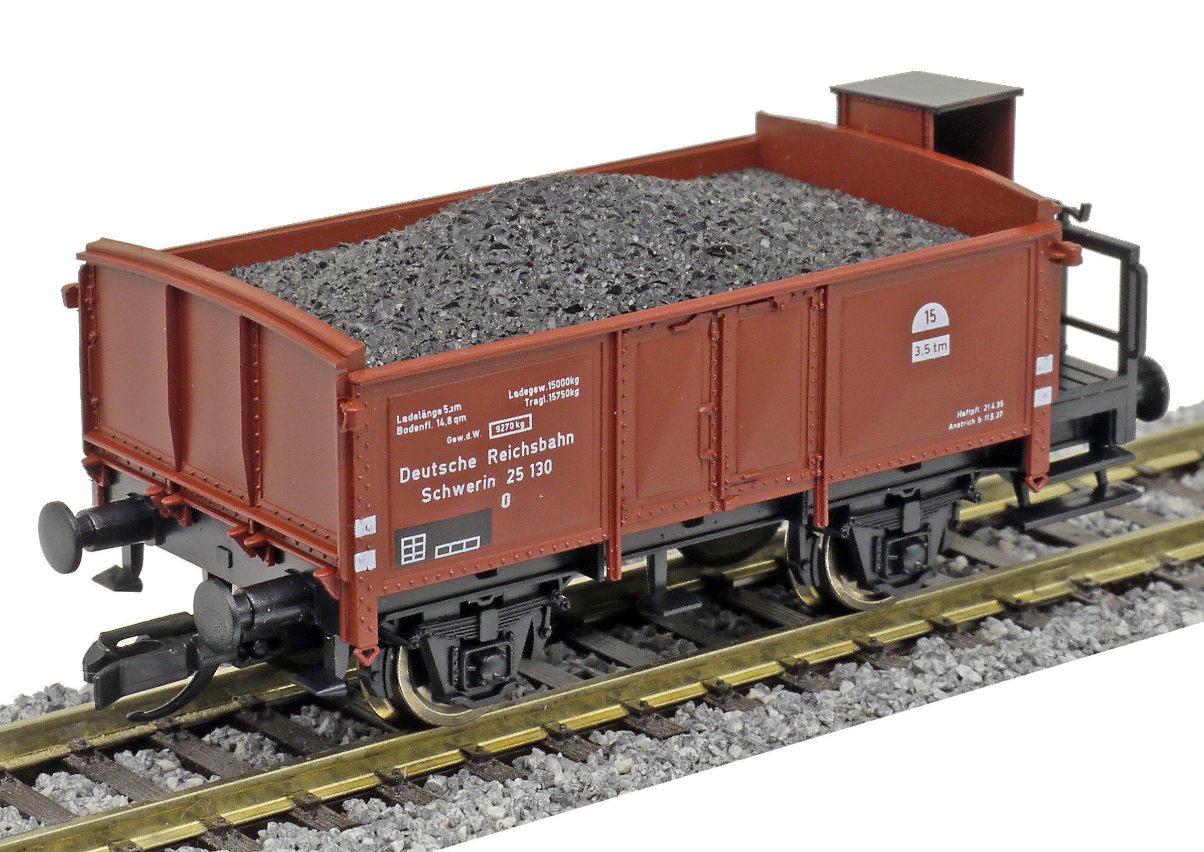 | otevřený nákladní vůz červenohnědý s brzdařskou budkou ložený uhlím |