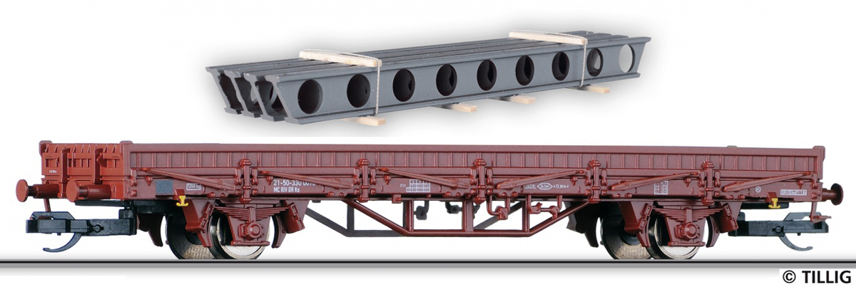 | nízkostěnný nákladní vůz červenohnědý s nákladem nosníků |