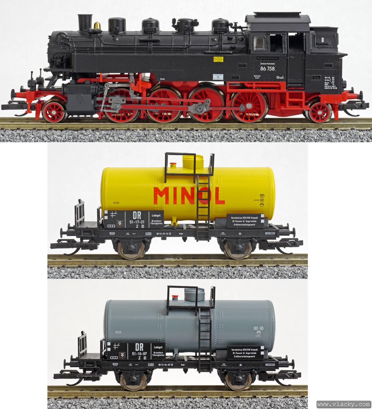 Popis   set parní lokomotivy BR 86 a dvou cisternových vozů