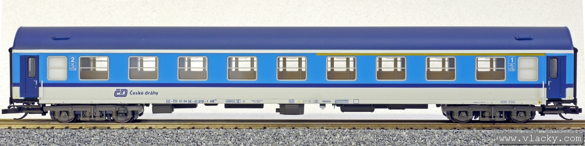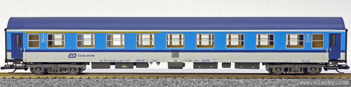 Popis   rychlíkový vůz modrý-bílý v barevném chematu „Najbrt“ 1./2. tř.