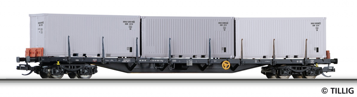 | nákladní plošinový vůz černý se třemi bílými kontejnery |