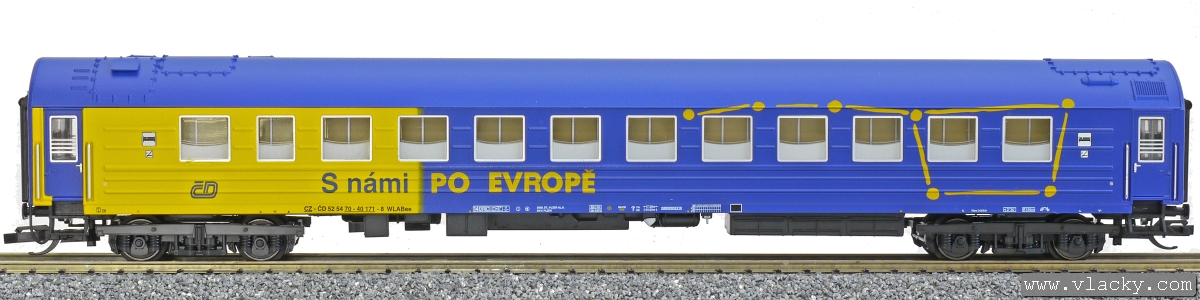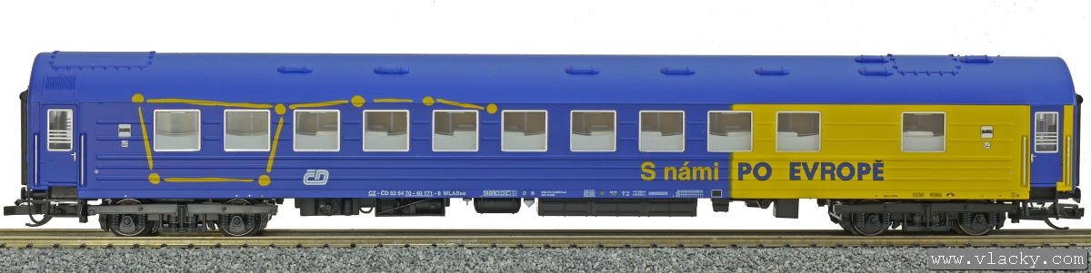 | lůžkový vůz modrý-žlutý s reklamním potiskem „S námi PO EVROPĚ“ |