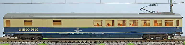 | modrý-slonová kost, šedá střecha s pantografem, jídelní vůz „QuickPick“ |