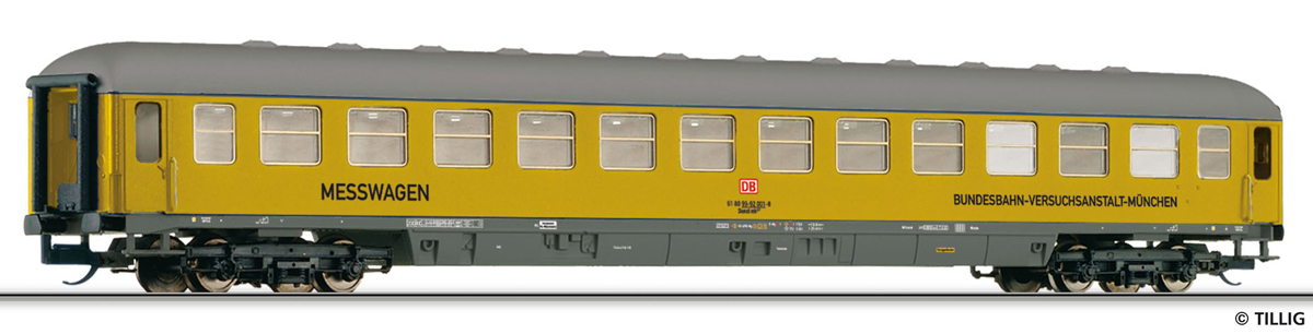 | žlutý s šedou střechou měřící vůz „Eisenbahn-Versuchsanstalt München“ |