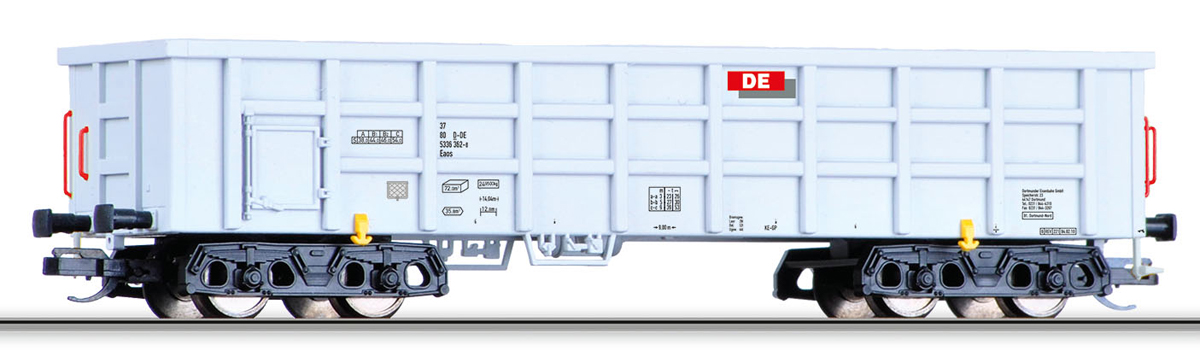 | vysokostěnný nákladní vůz světle šedý s červeným logem „Dortmunder Eisenbahn“ |