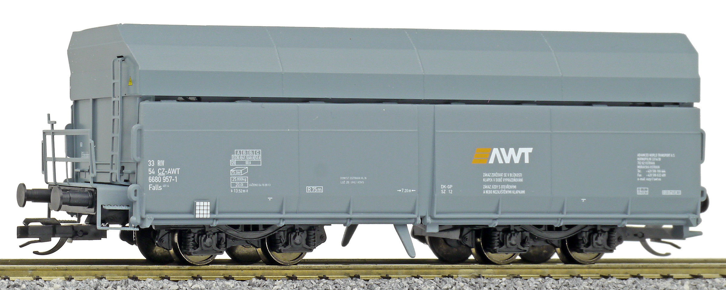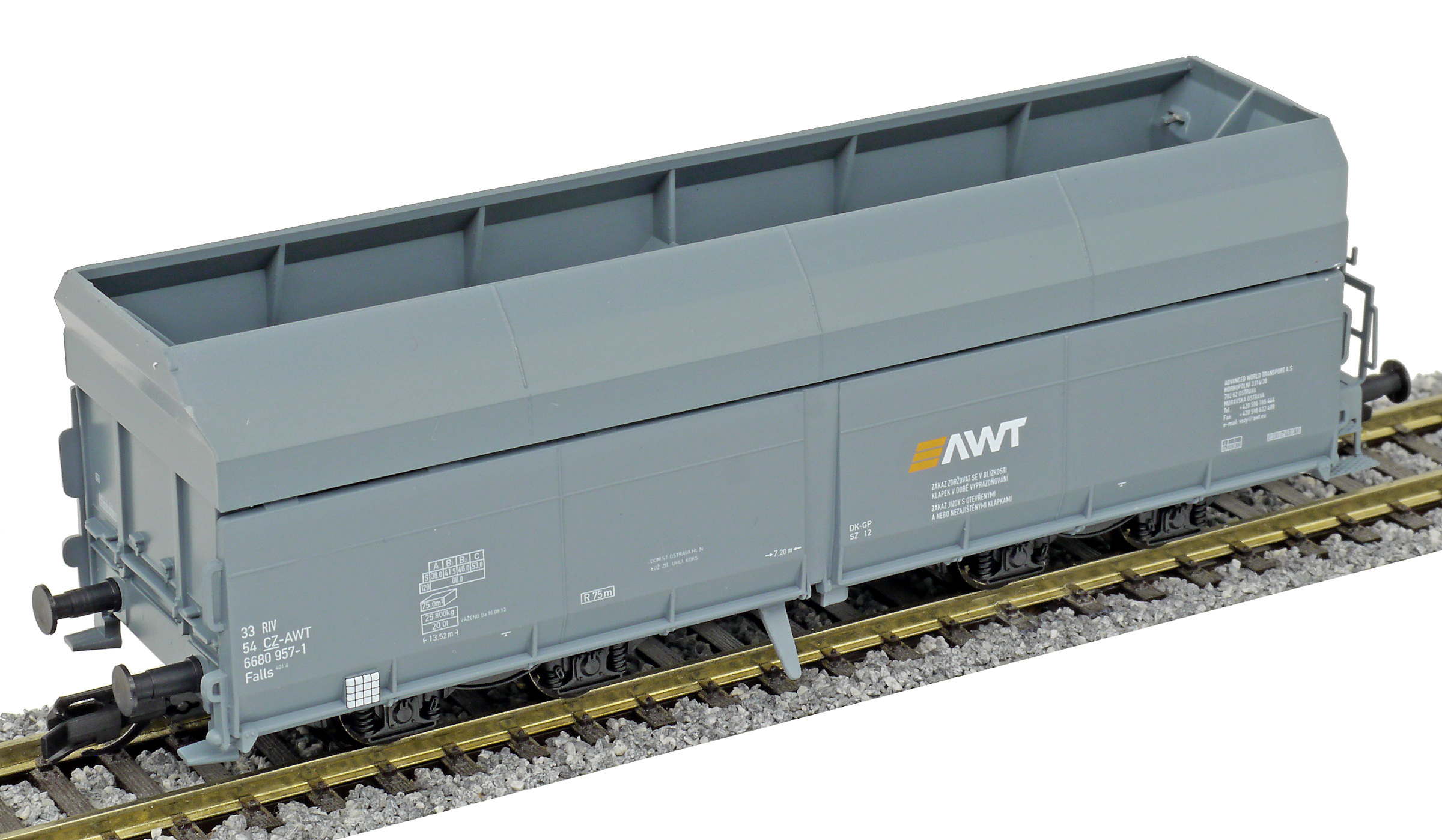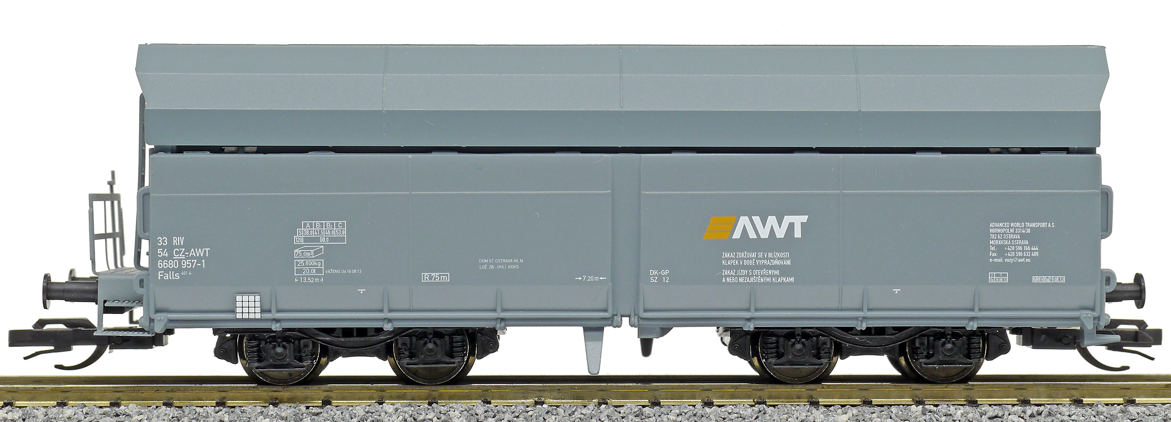 | nákladní samovýsypný vůz šedý s logem „AWT“ |