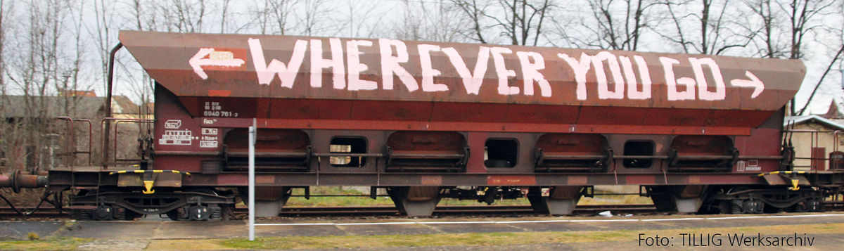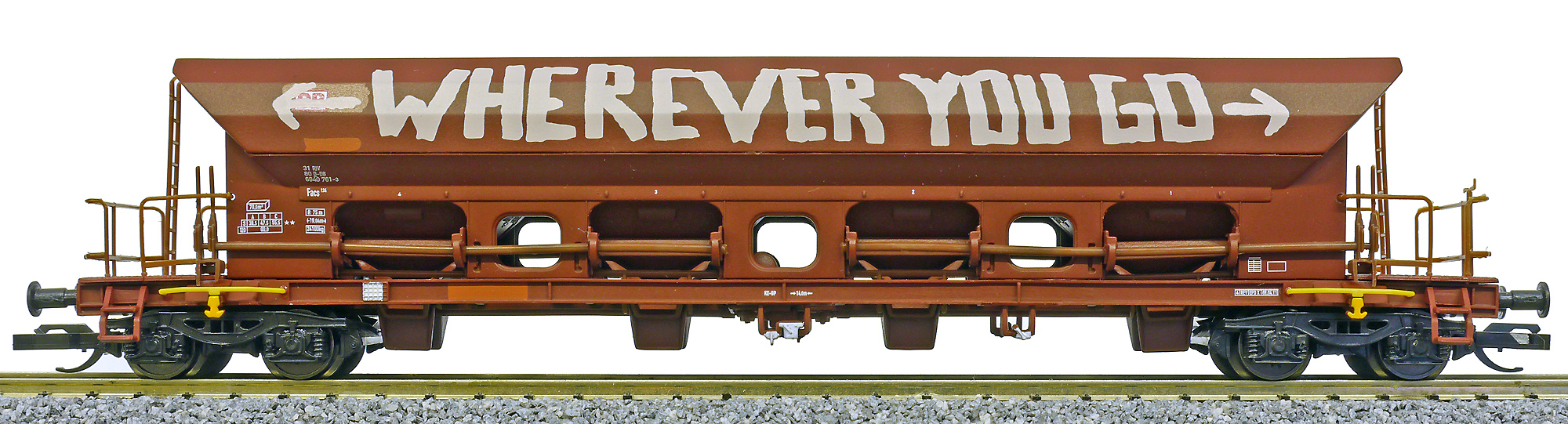 | nákladní samovýsypný vůz červenohnědý s graffiti |