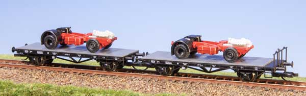 | set dvou plošinových vozů ex „Linz“ s nákladem podvozků aut |