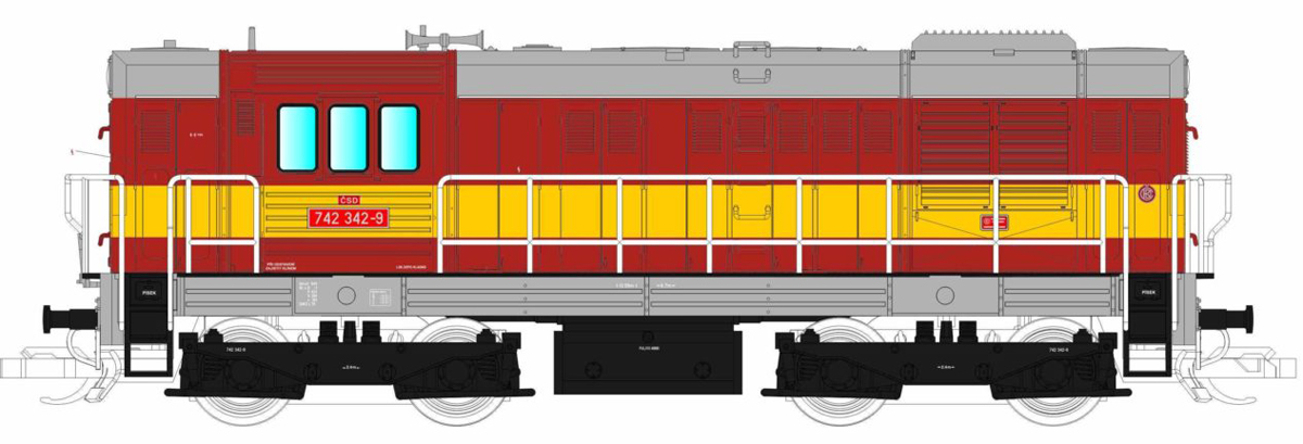 | dieselová lokomotiva červená se žlutým pásem, šedá střecha a rám, černé podvozky |