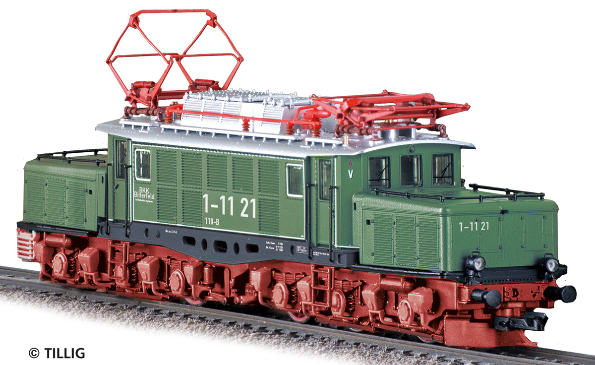| elektrická lokomotiva zelená se světle šedou střechou, vlečková „BKK Bitterfeld“ |