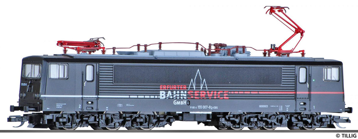 | elektrická lokomotiva černá s šedou střechou „Erfurter Bahnservice GmbH“ |